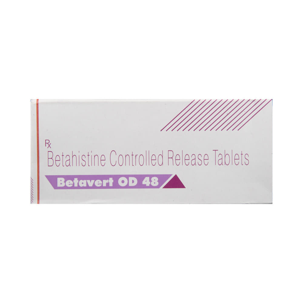 Betavert OD 48 Tablet CR is used to prevent and treat a disorder of the inner ear known as Ménière’s disease. The symptoms include dizziness (vertigo), ringing in the ears (tinnitus), and loss of hearing, probably caused by fluid in the ear. This medicine helps relieve the symptoms by reducing the amount of fluid. Betavert OD 48 Tablet CR should be swallowed whole with water and taken at the same time(s) each day to get the most benefit. Your doctor will decide what is the correct dose to relieve your symptoms and how often you need to take it. You may need to take this medicine for several months and you should take it for as long as prescribed by your doctor, even if you start feeling better. The most common side effects include headache, feeling sick, and indigestion (dyspepsia). You may also get stomach pain and bloating. Taking the medicine with food can help reduce stomach problems. Before taking this medicine, you should talk to your doctor if you have a stomach ulcer, asthma, or high or low blood pressure. You must also tell him/her what other medicines you are taking, to make sure you are safe. Also speak to your doctor if you are pregnant, trying to become pregnant, or breastfeeding.