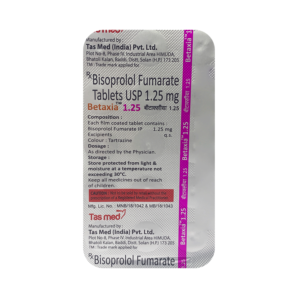 Betaxia 1.25 Tablet is a beta blocker that works specifically on the heart. It works by slowing down the heart rate and makes the heart more efficient at pumping blood around the body.