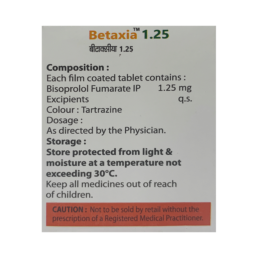 Betaxia 1.25 Tablet is used to manage heart failure, particularly in patients recovering from a heart attack. It also treats high blood pressure (hypertension), angina (chest pain), and arrhythmia (irregular rhythms). It improves heart function, reduces strain, and lowers the risk of future cardiac events. Betaxia 1.25 Tablet helps improve cardiac output and prevent heart failure progression. It helps regulate blood pressure, enhances blood flow, and supports overall cardiovascular health. This makes it essential to post-myocardial infarction (heart attack) care, ensuring long-term heart protection. It may also be used to relieve the symptoms caused by an overactive thyroid gland.Your doctor may prescribe Betaxia 1.25 Tablet as part of a comprehensive heart care plan, often alongside lifestyle modifications like a heart-healthy diet, regular exercise, and smoking cessation. It is important to take Betaxia 1.25 Tablet exactly as directed by your doctor. Do not stop taking this medication without consulting your doctor, as sudden discontinuation may increase heart risks.Common side effects of Betaxia 1.25 Tablet include fatigue, headache, slow heart rate, dizziness, and nausea. These are usually mild and short-lived. It may also cause shortness of breath or low blood pressure in some people. To reduce the risk of side effects, your doctor may start the medicine at a low dose and gradually increase it. Consult your doctor if the side effects bother you or do not go away.Before taking Betaxia 1.25 Tablet, let your doctor know if you have any liver problems. It may also not be suitable for people who have a slow heart rate, severe circulation problems, severe heart failure, or low blood pressure. Pregnant or breastfeeding women should also consult their doctor before taking it. Have your blood pressure checked regularly to ensure the efficacy of the treatment. Avoid drinking alcohol as it may increase certain side effects.