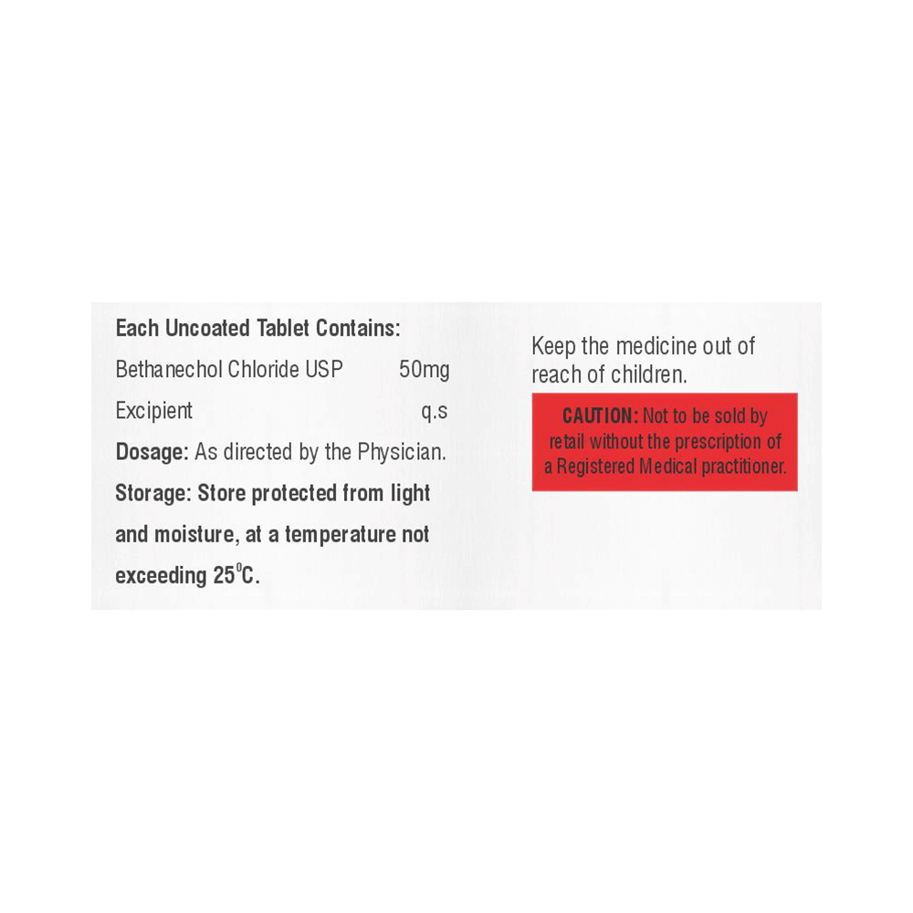 Bethnacol 50 Tablet is used in the treatment of urinary retention (inability to urinate), which usually occurs following surgery or after giving birth. It helps contract the muscles of the bladder, which further leads to urination. Bethnacol 50 Tablet is advised to take it in a dose and duration as per prescription. It can be taken on an empty stomach, but take it at a fixed time regularly. You should not stop taking the medicine without consulting the doctor, as it may lead to the worsening of your symptoms.Bethnacol 50 Tablet is generally well tolerated, with minimal side effects. However, in rare cases, some individuals may experience mild symptoms such as stomach cramps, nausea, belching, diarrhea, increased bowel sounds, excessive saliva, or a stronger urge to urinate. If these symptoms persist, worsen, or cause discomfort, consult your doctor.Before receiving the treatment, inform your doctor if you are on any medication for any health conditions. If you are pregnant, tell your doctor before taking Bethnacol 50 Tablet. Let your doctor also know about all the medications you are taking, as some medicines may interact with Bethnacol 50 Tablet.
