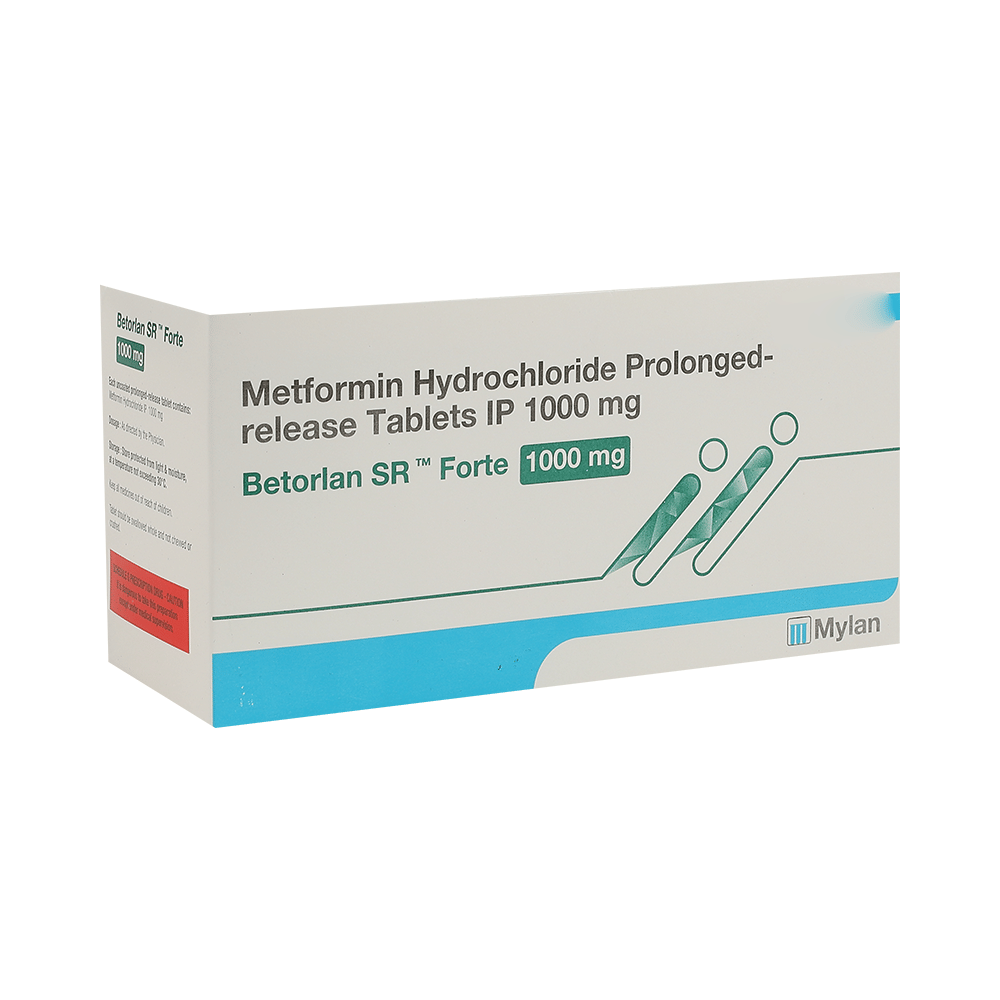 Betorlan SR Forte 1000mg Tablet is a medicine used to treat type 2 diabetes mellitus. It helps control blood sugar levels and thus prevents serious complications of diabetes. It is also used to treat a menstruation-related disorder known as polycystic ovary syndrome (PCOS) in women. Betorlan SR Forte 1000mg Tablet is best taken with food to avoid nausea and abdominal pain. You should take it regularly, at the same time each day, to get the most benefit. You should not stop taking this medicine unless your doctor recommends it. Your lifestyle plays a big part in controlling diabetes. Therefore, it is important to stay on the diet and exercise program recommended by your doctor while taking this medicine.The most common side effects of this medicine include diarrhea, nausea, vomiting, abdominal discomfort, headache, and loss of appetite. Some people may develop hypoglycemia (low blood sugar level) when this medicine is taken along with other antidiabetic medicines or alcohol or upon skipping a meal. Monitor your blood sugar levels regularly while taking it.Before taking this medicine, inform your doctor if you have any kidney, liver, or heart problems. Pregnant or breastfeeding women should also consult their doctor before taking it. Your doctor will check your kidney function before starting treatment with it. Avoid excessive alcohol intake while taking it, as this may increase the risk of developing some side effects.