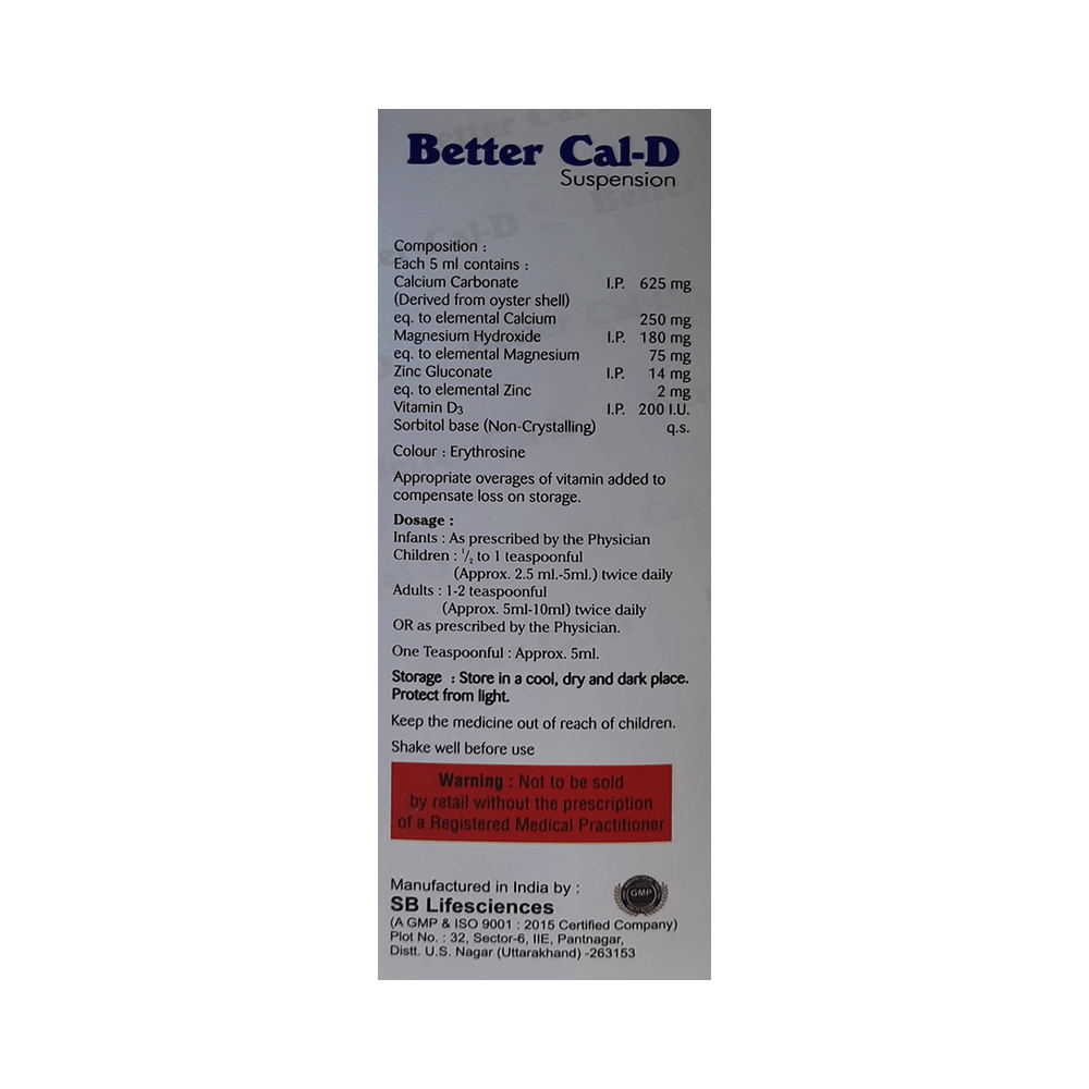 Take this medicine in the dose and duration as advised by your doctor. Check the label for directions before use. Measure it with a measuring cup and take it by mouth. Shake well before use. Better Cal-D Oral Suspension may be taken with or without food, but it is better to take it at a fixed time.