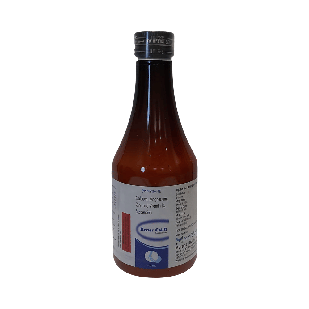 In Treatment of Nutritional deficienciesBetter Cal-D Oral Suspension is a nutritional supplement that is used to prevent or treat low blood calcium levels in people who do not get enough calcium from their diets. It improves the level of calcium in the body. This helps keep your bones strong and healthy and reduce the risk of any bone disorders like osteoporosis. Calcium is also necessary for normal functioning of nerves, cells, muscle and heart. This combination contains other vitamins and minerals that help in strengthening the immune system, enhance metabolism of the body and improve overall health.