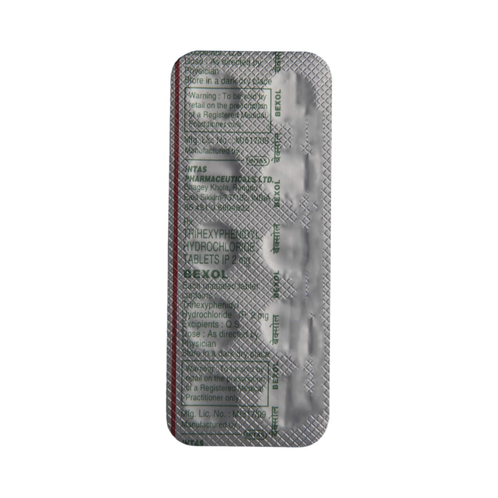 Bexol Tablet is used with other medicines to treat Parkinson’s disease. It’s also used to treat severe movement side effects caused by certain drugs (drug-induced movement disorder). Bexol Tablet can be taken with food or without food. Consider taking it with food if it causes an upset stomach. Take it at the same time each day; this helps maintain a consistent level of medicine in the body. Take this medicine in the dose and duration as advised by your doctor, and if you have missed a dose, take it as soon as you remember. Do not skip any doses and finish the full course of treatment even if you feel better. This medication must not be stopped suddenly without talking to the doctor, as it may result in a worsening of symptoms.Some common side effects of this medicine include nausea, vomiting, and blurred vision. It even causes dizziness and sleepiness, so do not drive or do anything that requires mental focus until you know how this medicine affects you. Dry mouth may occur commonly while using this medicine, so try to do frequent mouth rinses, maintain good oral hygiene, and increase water intake. Avoid wearing contact lenses, as Bexol Tablet may cause dry eyes as well. It is important to inform your doctor if you suffer from glaucoma or have trouble passing urine.Before using Bexol Tablet, you should tell your doctor if you've ever had heart problems, problems with passing urine, liver or kidney disease. It may also affect, or be affected by, some other drugs you are using, so let your doctor know what these are to be safe. Pregnant or breastfeeding mothers should consult their doctor before starting treatment with this medicine.