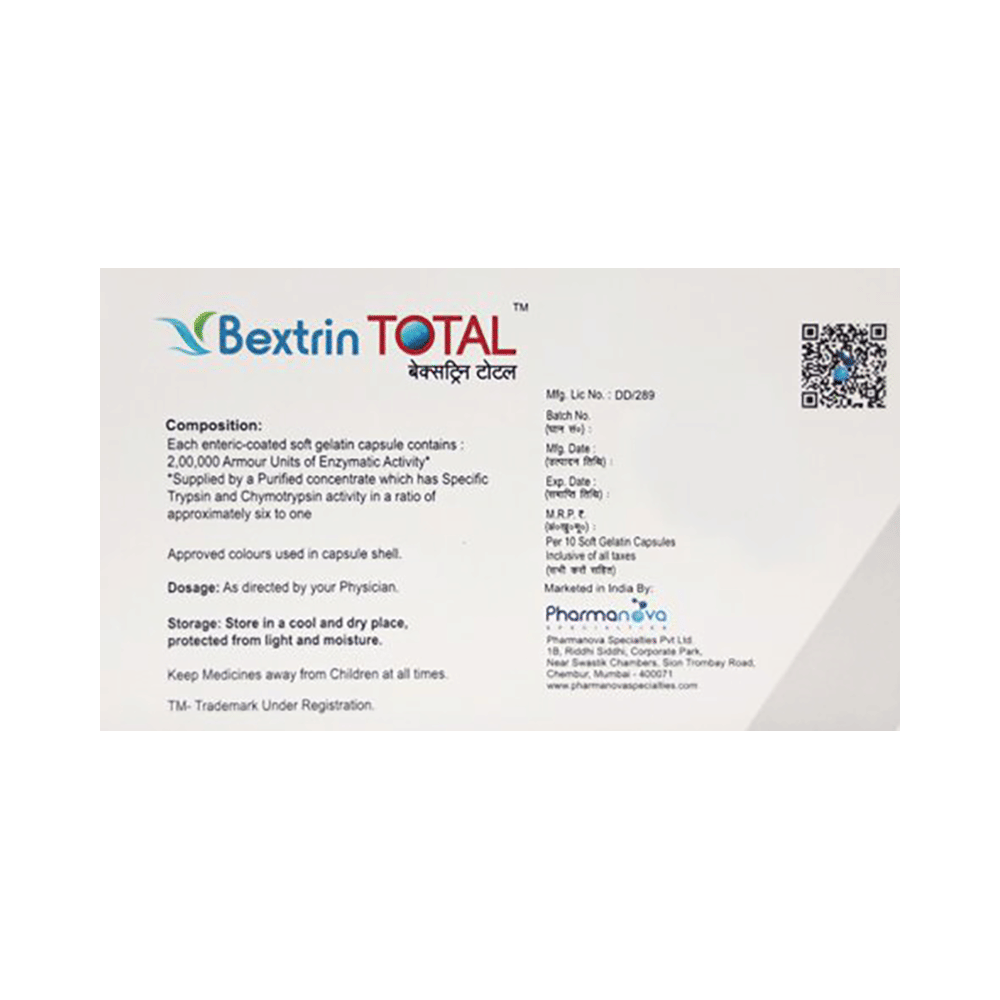 Take this medicine in the dose and duration as advised by your doctor. Swallow it as a whole. Do not chew, crush or break it. Bextrin Total Capsule may be taken with or without food, but it is better to take it at a fixed time.