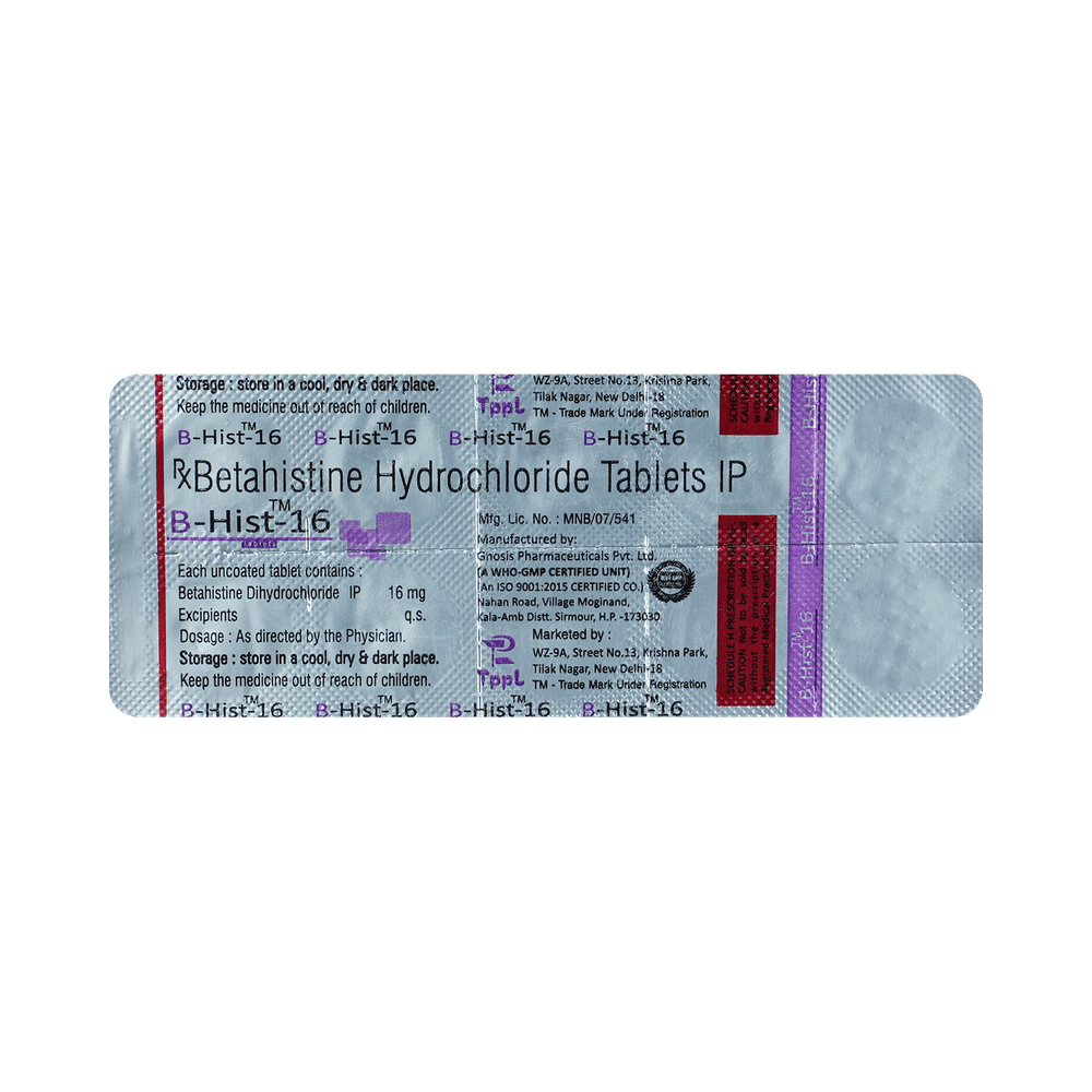 Bhist 16mg Tablet is used to prevent and treat a disorder of the inner ear known as Ménière’s disease. The symptoms include dizziness (vertigo), ringing in the ears (tinnitus), and loss of hearing, probably caused by fluid in the ear. This medicine helps relieve the symptoms by reducing the amount of fluid. Bhist 16mg Tablet should be swallowed whole with water and taken at the same time(s) each day to get the most benefit. Your doctor will decide what is the correct dose to relieve your symptoms and how often you need to take it. You may need to take this medicine for several months and you should take it for as long as prescribed by your doctor, even if you start feeling better. The most common side effects include headache, feeling sick, and indigestion (dyspepsia). You may also get stomach pain and bloating. Taking the medicine with food can help reduce stomach problems. Before taking this medicine, you should talk to your doctor if you have a stomach ulcer, asthma, or high or low blood pressure. You must also tell him/her what other medicines you are taking, to make sure you are safe. Also speak to your doctor if you are pregnant, trying to become pregnant, or breastfeeding.