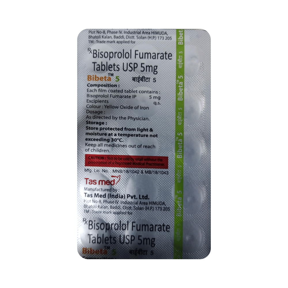 Bibeta 5 Tablet is used to manage heart failure, particularly in patients recovering from a heart attack. It also treats high blood pressure (hypertension), angina (chest pain), and arrhythmia (irregular rhythms). It improves heart function, reduces strain, and lowers the risk of future cardiac events. Bibeta 5 Tablet helps improve cardiac output and prevent heart failure progression. It helps regulate blood pressure, enhances blood flow, and supports overall cardiovascular health. This makes it essential to post-myocardial infarction (heart attack) care, ensuring long-term heart protection. It may also be used to relieve the symptoms caused by an overactive thyroid gland.Your doctor may prescribe Bibeta 5 Tablet as part of a comprehensive heart care plan, often alongside lifestyle modifications like a heart-healthy diet, regular exercise, and smoking cessation. It is important to take Bibeta 5 Tablet exactly as directed by your doctor. Do not stop taking this medication without consulting your doctor, as sudden discontinuation may increase heart risks.Common side effects of Bibeta 5 Tablet include fatigue, headache, slow heart rate, dizziness, and nausea. These are usually mild and short-lived. It may also cause shortness of breath or low blood pressure in some people. To reduce the risk of side effects, your doctor may start the medicine at a low dose and gradually increase it. Consult your doctor if the side effects bother you or do not go away.Before taking Bibeta 5 Tablet, let your doctor know if you have any liver problems. It may also not be suitable for people who have a slow heart rate, severe circulation problems, severe heart failure, or low blood pressure. Pregnant or breastfeeding women should also consult their doctor before taking it. Have your blood pressure checked regularly to ensure the efficacy of the treatment. Avoid drinking alcohol as it may increase certain side effects.
