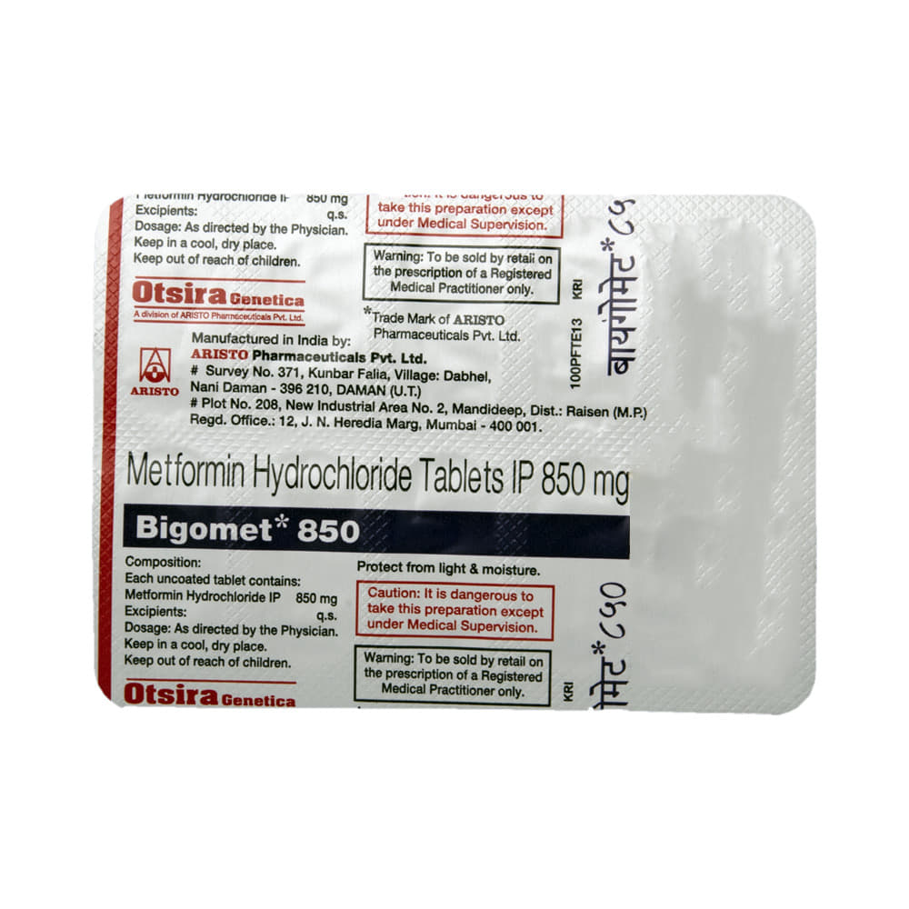 Bigomet 850 Tablet is a medicine used to treat type 2 diabetes mellitus. It helps control blood sugar levels and thus prevents serious complications of diabetes. It is also used to treat a menstruation-related disorder known as polycystic ovary syndrome (PCOS) in women. Bigomet 850 Tablet is best taken with food to avoid nausea and abdominal pain. You should take it regularly, at the same time each day, to get the most benefit. You should not stop taking this medicine unless your doctor recommends it. Your lifestyle plays a big part in controlling diabetes. Therefore, it is important to stay on the diet and exercise program recommended by your doctor while taking this medicine.The most common side effects of this medicine include diarrhea, nausea, vomiting, abdominal discomfort, headache, and loss of appetite. Some people may develop hypoglycemia (low blood sugar level) when this medicine is taken along with other antidiabetic medicines or alcohol or upon skipping a meal. Monitor your blood sugar levels regularly while taking it.Before taking this medicine, inform your doctor if you have any kidney, liver, or heart problems. Pregnant or breastfeeding women should also consult their doctor before taking it. Your doctor will check your kidney function before starting treatment with it. Avoid excessive alcohol intake while taking it, as this may increase the risk of developing some side effects.