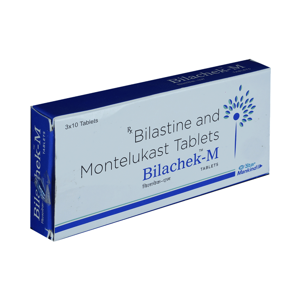 Bilachek-M Tablet is a combination medicine used to treat allergic rhinitis, commonly known as hay fever. It helps relieve symptoms like sneezing, runny or blocked nose, itching, and watery eyes. It provides effective relief from allergy symptoms and improves breathing. To get the best results, take Bilachek-M Tablet exactly as prescribed by your doctor. It is usually taken once daily on an empty stomach, at least one hour before or two hours after meals, as food can affect its absorption. Avoid skipping doses, and do not stop the medication abruptly without consulting your doctor. To maximize its benefits, stay away from known allergens, keep your living environment dust-free, and maintain proper hydration.Common side effects of Bilachek-M Tablet include headache, cough, fatigue, fever, abdominal pain, diarrhea, drowsiness, and otitis media. These symptoms are usually mild and go away on their own. If any of these side effects persist or bother you, let your doctor know. To reduce drowsiness, avoid alcohol and ensure you get enough rest.While on Bilachek-M Tablet, do not drive or operate heavy machinery as it can cause dizziness or sleepiness. Pregnant or breastfeeding women should consult their doctor before using this medicine. If you have liver or kidney problems, asthma, or a history of mental health conditions, inform your doctor before starting the treatment.