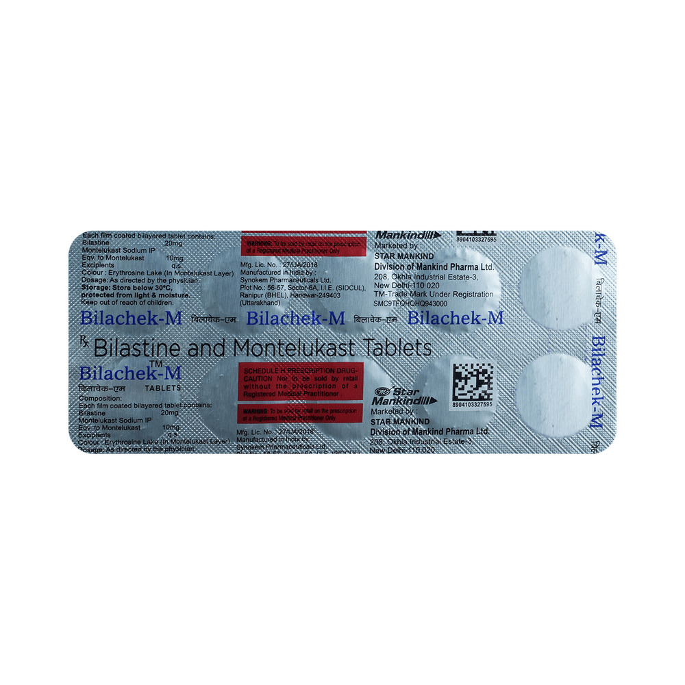 Bilachek-M Tablet is a combination of two medicines: bilastine and montelukast. Bilastine is an antiallergic medication. It treats allergy symptoms such as itching, swelling, and rashes by blocking the effects of a chemical messenger (histamine) in the body. Montelukast works by blocking the action of leukotriene, a chemical messenger. This reduces inflammation in the airways to relieve symptoms of allergies.