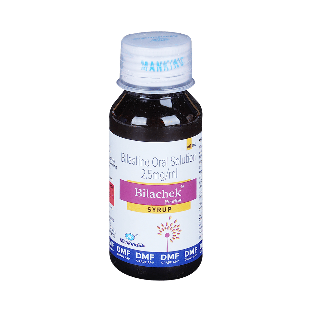 Bilachek Syrup is an anti-allergic medicine. It is given to children to treat a wide range of symptoms associated with allergic conditions such as hay fever, urticaria (hives), conjunctivitis (red, itchy eye), and the common cold. These symptoms may include watery eyes, runny nose, sneezing, and itching. Bilachek Syrup can be taken one hour before or two hours after food, but take it at the same time to get the most benefit. It should be taken as your doctor's advice. The dose and how often you take it depends on what you are taking it for. Your doctor will decide how much you need to improve your symptoms. Remember dosage is decided on the basis of the type of medicine (tablet or syrup ), age, and present medical condition of the person. You should take this medicine for as long as it is prescribed for you. If you do not observe any improvement in the symptoms, consult with the doctor.The most common side effects of this medicine include headaches and drowsiness. If these bother you or appear serious, let your doctor know. There may be ways of reducing or preventing them. Generally, it is advised to drink plenty of fluids while on treatment with this medicine. To overcome dizziness, avoid driving or attention-seeking activities until you know how the medicine affects you.Before taking this medicine, let your doctor know if you are pregnant, or breastfeeding. Your doctor should also know about all other medicines you are taking as many of these may make this medicine less effective or change the way it works. You must avoid fruit juice before taking the medicine.