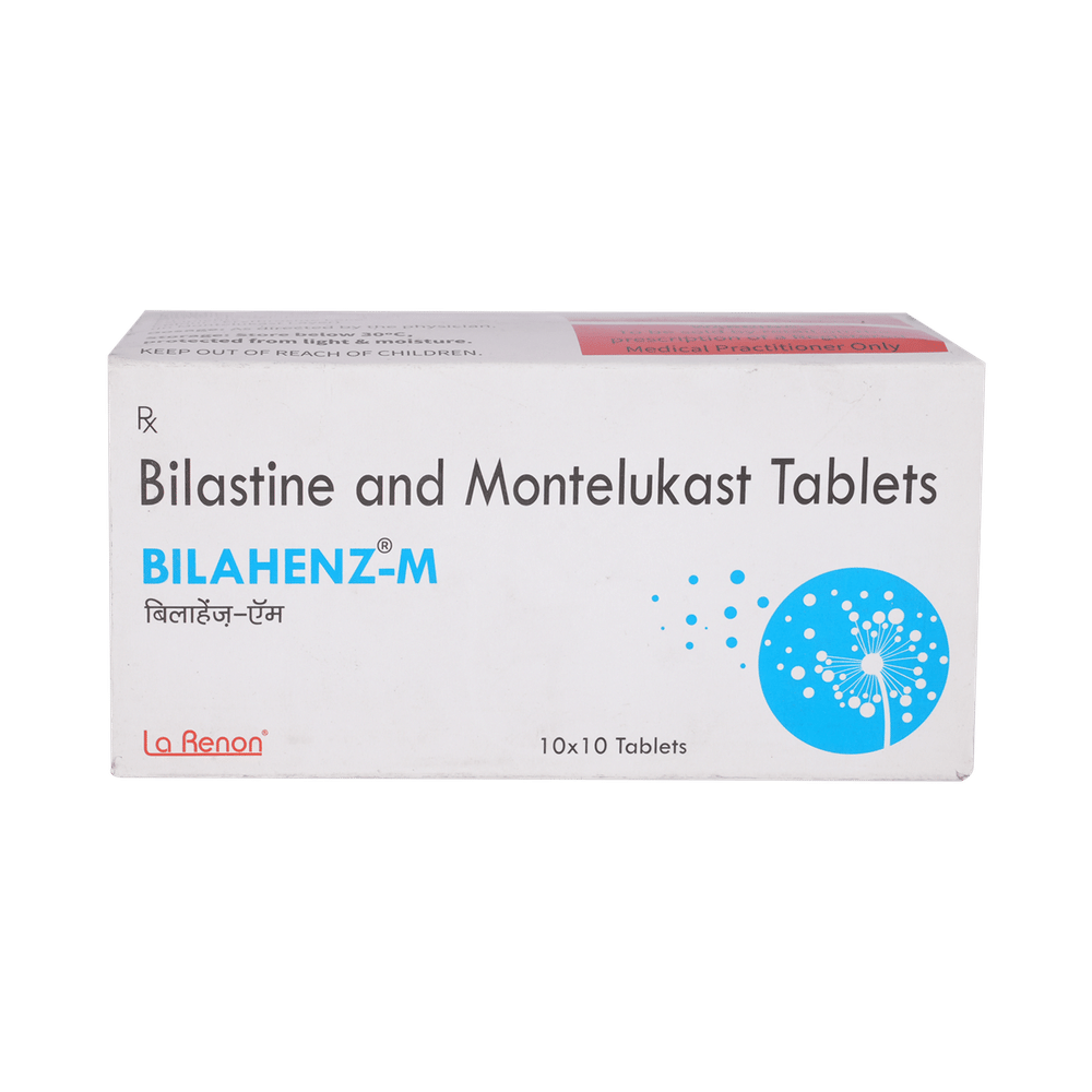 Bilahenz-M Tablet is a combination of two medicines: bilastine and montelukast. Bilastine is an antiallergic medication. It treats allergy symptoms such as itching, swelling, and rashes by blocking the effects of a chemical messenger (histamine) in the body. Montelukast works by blocking the action of leukotriene, a chemical messenger. This reduces inflammation in the airways to relieve symptoms of allergies.