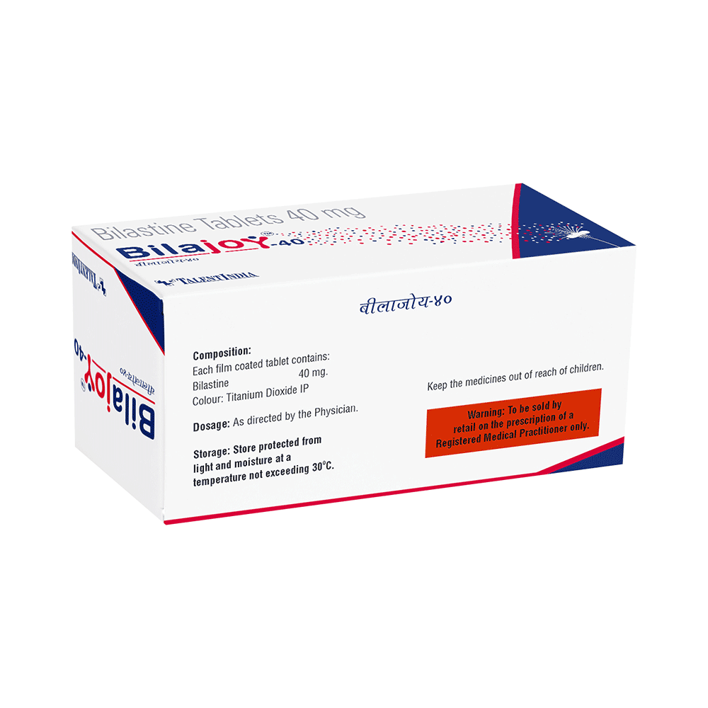 Bilajoy 40 Tablet belongs to a group of medicines known as antihistamines. It is used in the treatment of allergy symptoms such as runny nose, stuffy nose, sneezing, watery eyes, and congestion or stuffiness. Bilajoy 40 Tablet can be taken one hour before or two hours after food, but take it at the same time to get the most benefit. It should be taken as your doctor's advice. The dose and how often you take it depend on what you are taking it for. Your doctor will decide how much you need to improve your symptoms. Remember, dosage is decided on the basis of the type of medicine (tablet or syrup ), age, and present medical condition of the person. You should take this medicine for as long as it is prescribed for you. If you do not observe any improvement in the symptoms, consult with the doctor.The most common side effects of this medicine include headaches and drowsiness. If these bother you or appear serious, let your doctor know. There may be ways of reducing or preventing them. Generally, it is advised to drink plenty of fluids while on treatment with this medicine. To overcome dizziness, avoid driving or attention-seeking activities until you know how the medicine affects you.Before taking this medicine, let your doctor know if you are pregnant or breastfeeding. Your doctor should also know about all other medicines you are taking as many of these may make this medicine less effective or change the way it works. You must avoid fruit juice before taking the medicine.