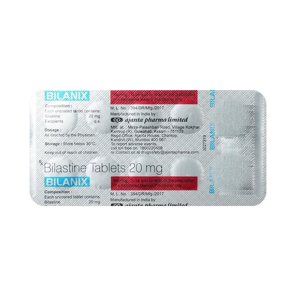Bilanix Tablet belongs to a group of medicines known as antihistamines. It is used in the treatment of allergy symptoms such as runny nose, stuffy nose, sneezing, watery eyes, and congestion or stuffiness. Bilanix Tablet can be taken one hour before or two hours after food, but take it at the same time to get the most benefit. It should be taken as your doctor's advice. The dose and how often you take it depend on what you are taking it for. Your doctor will decide how much you need to improve your symptoms. Remember, dosage is decided on the basis of the type of medicine (tablet or syrup ), age, and present medical condition of the person. You should take this medicine for as long as it is prescribed for you. If you do not observe any improvement in the symptoms, consult with the doctor.The most common side effects of this medicine include headaches and drowsiness. If these bother you or appear serious, let your doctor know. There may be ways of reducing or preventing them. Generally, it is advised to drink plenty of fluids while on treatment with this medicine. To overcome dizziness, avoid driving or attention-seeking activities until you know how the medicine affects you.Before taking this medicine, let your doctor know if you are pregnant or breastfeeding. Your doctor should also know about all other medicines you are taking as many of these may make this medicine less effective or change the way it works. You must avoid fruit juice before taking the medicine.