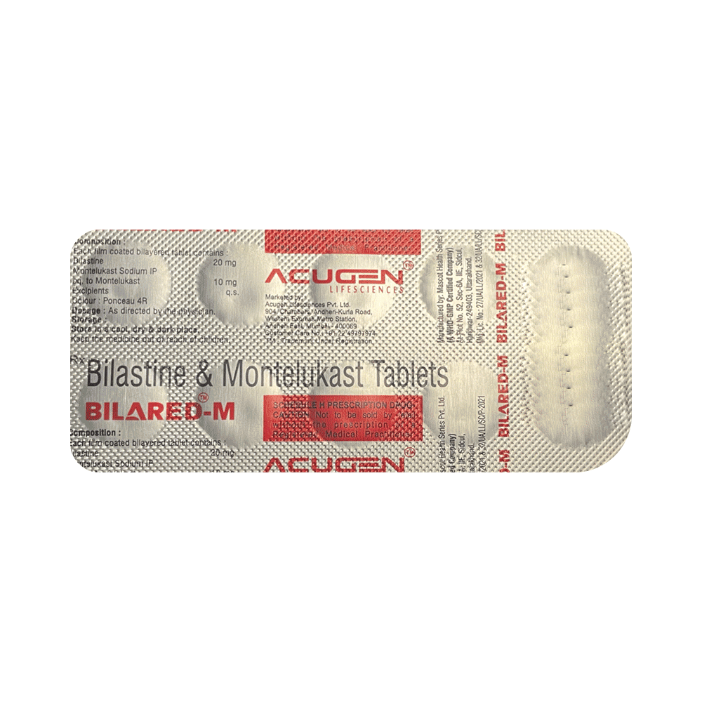 Bilared-M Tablet is a combination of two medicines: bilastine and montelukast. Bilastine is an antiallergic medication. It treats allergy symptoms such as itching, swelling, and rashes by blocking the effects of a chemical messenger (histamine) in the body. Montelukast works by blocking the action of leukotriene, a chemical messenger. This reduces inflammation in the airways to relieve symptoms of allergies.