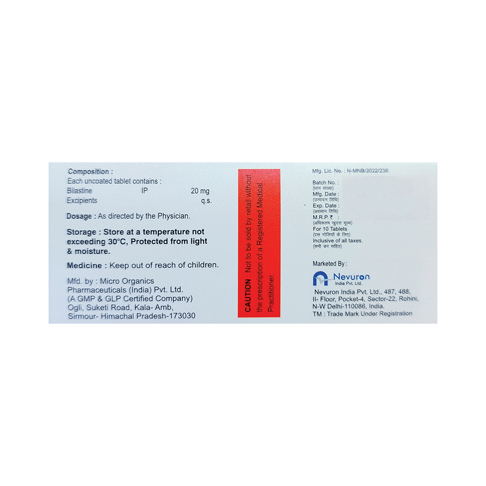 Bilaron Tablet belongs to a group of medicines known as antihistamines. It is used in the treatment of allergy symptoms such as runny nose, stuffy nose, sneezing, watery eyes, and congestion or stuffiness. Bilaron Tablet can be taken one hour before or two hours after food, but take it at the same time to get the most benefit. It should be taken as your doctor's advice. The dose and how often you take it depend on what you are taking it for. Your doctor will decide how much you need to improve your symptoms. Remember, dosage is decided on the basis of the type of medicine (tablet or syrup ), age, and present medical condition of the person. You should take this medicine for as long as it is prescribed for you. If you do not observe any improvement in the symptoms, consult with the doctor.The most common side effects of this medicine include headaches and drowsiness. If these bother you or appear serious, let your doctor know. There may be ways of reducing or preventing them. Generally, it is advised to drink plenty of fluids while on treatment with this medicine. To overcome dizziness, avoid driving or attention-seeking activities until you know how the medicine affects you.Before taking this medicine, let your doctor know if you are pregnant or breastfeeding. Your doctor should also know about all other medicines you are taking as many of these may make this medicine less effective or change the way it works. You must avoid fruit juice before taking the medicine.