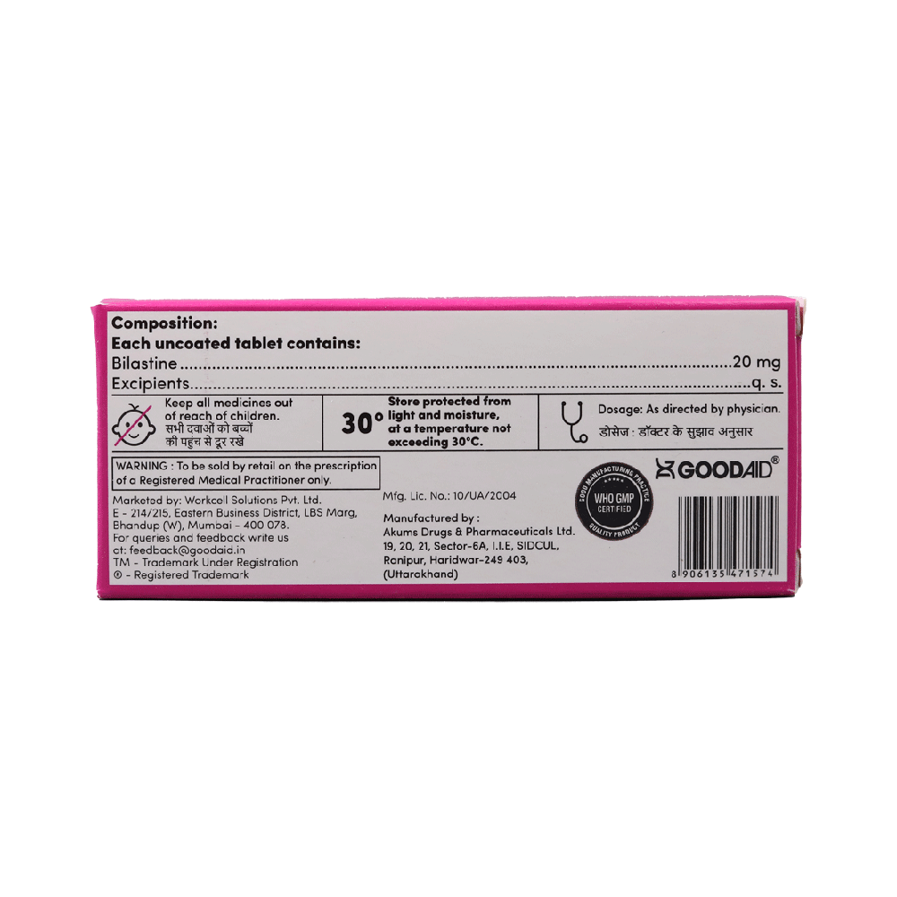 Bilasaid 20 Tablet belongs to a group of medicines known as antihistamines. It is used in the treatment of allergy symptoms such as runny nose, stuffy nose, sneezing, watery eyes, and congestion or stuffiness. Bilasaid 20 Tablet can be taken one hour before or two hours after food, but take it at the same time to get the most benefit. It should be taken as your doctor's advice. The dose and how often you take it depend on what you are taking it for. Your doctor will decide how much you need to improve your symptoms. Remember, dosage is decided on the basis of the type of medicine (tablet or syrup ), age, and present medical condition of the person. You should take this medicine for as long as it is prescribed for you. If you do not observe any improvement in the symptoms, consult with the doctor.The most common side effects of this medicine include headaches and drowsiness. If these bother you or appear serious, let your doctor know. There may be ways of reducing or preventing them. Generally, it is advised to drink plenty of fluids while on treatment with this medicine. To overcome dizziness, avoid driving or attention-seeking activities until you know how the medicine affects you.Before taking this medicine, let your doctor know if you are pregnant or breastfeeding. Your doctor should also know about all other medicines you are taking as many of these may make this medicine less effective or change the way it works. You must avoid fruit juice before taking the medicine.