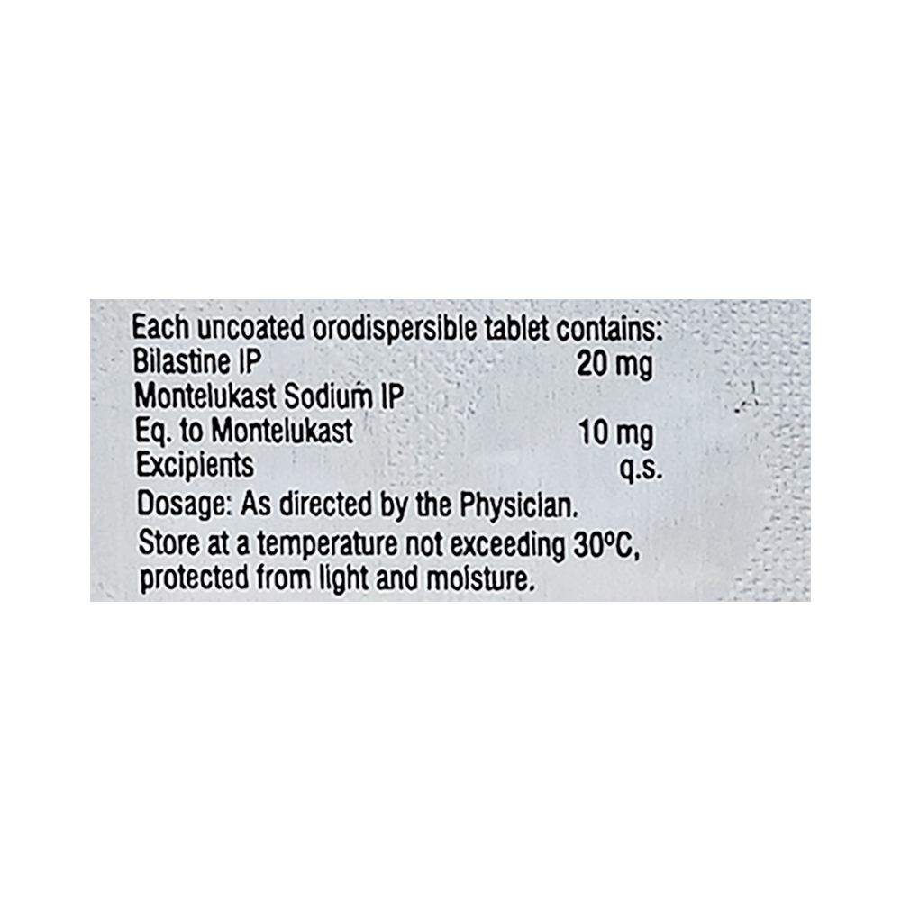In Treatment of Allergic conditionsBilashine M 20mg/10mg ODT Tablet provides relief from allergic symptoms such as blocked or runny nose, sneezing and itchy or watery eyes caused by seasonal hay fever (allergic rhinitis), seasonal allergies, and allergies. It works by reducing certain substances in the body that are responsible for the allergic symptoms. Bilashine M 20mg/10mg ODT Tablet reduces swelling in the airways and gives relief from the symptoms of asthma. In Treatment of Allergic rhinitisBilashine M 20mg/10mg ODT Tablet provides relief from allergic symptoms such as blocked or runny nose, sneezing, and itchy or watery eyes caused by seasonal hay fever (allergic rhinitis), seasonal allergies, and other allergies. It works by reducing certain substances in the body that are responsible for the allergic symptoms. Bilashine M 20mg/10mg ODT Tablet reduces swelling in the airways and gives relief from allergic reactions.show moreshow less