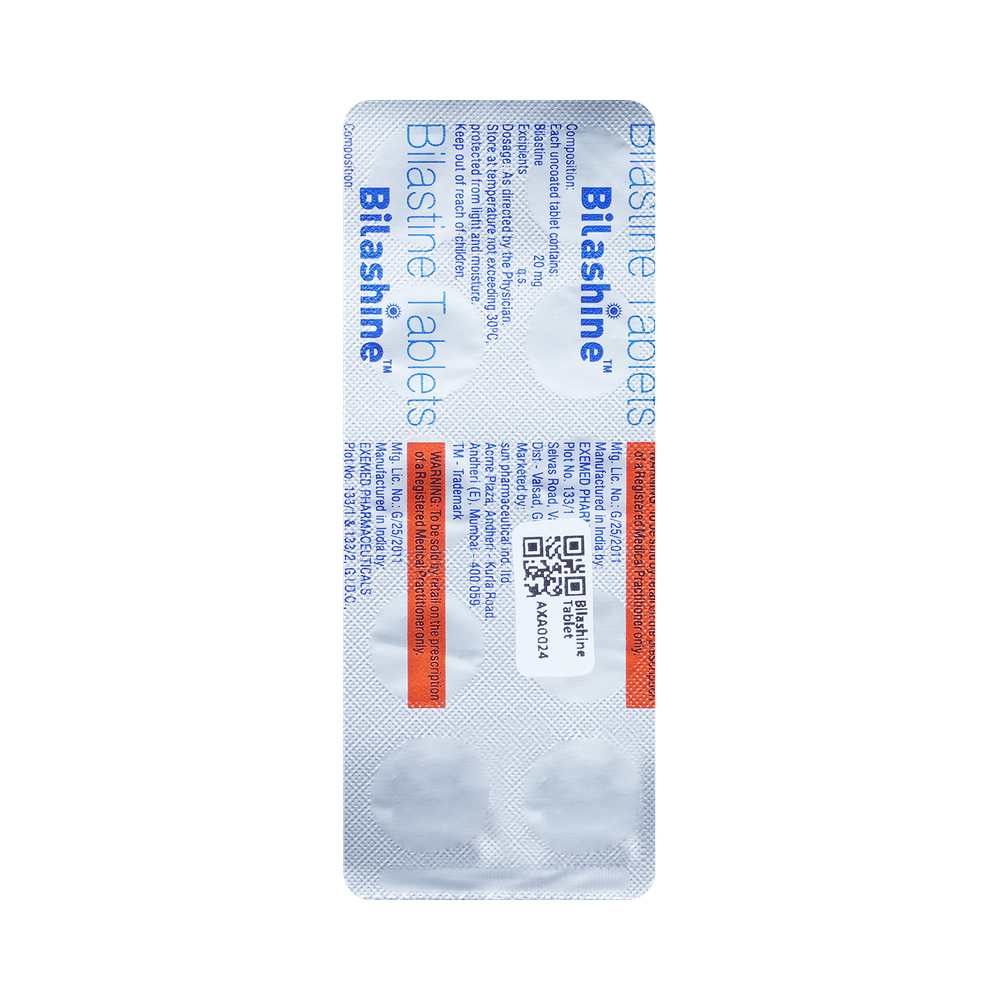 Bilashine Tablet is an antiallergic medication. It treats allergy symptoms such as such as itching, swelling, and rashes by blocking the effects of a chemical messenger (histamine) in the body.
