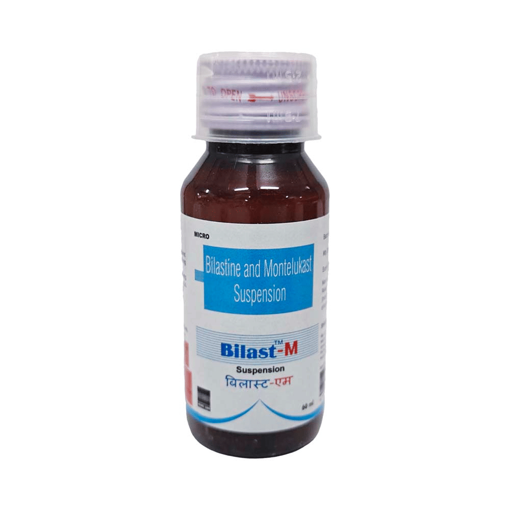 Bilast-M Oral Suspension is a combination medicine used to treat allergic rhinitis, commonly known as hay fever. It helps relieve symptoms like sneezing, runny or blocked nose, itching, and watery eyes. It provides effective relief from allergy symptoms and improves breathing. To get the best results, take Bilast-M Oral Suspension exactly as prescribed by your doctor. It is usually taken once daily on an empty stomach, at least one hour before or two hours after meals, as food can affect its absorption. Avoid skipping doses, and do not stop the medication abruptly without consulting your doctor. To maximize its benefits, stay away from known allergens, keep your living environment dust-free, and maintain proper hydration.Common side effects of Bilast-M Oral Suspension include headache, cough, fatigue, fever, abdominal pain, diarrhea, drowsiness, and otitis media. These symptoms are usually mild and go away on their own. If any of these side effects persist or bother you, let your doctor know. To reduce drowsiness, avoid alcohol and ensure you get enough rest.While on Bilast-M Oral Suspension, do not drive or operate heavy machinery as it can cause dizziness or sleepiness. Pregnant or breastfeeding women should consult their doctor before using this medicine. If you have liver or kidney problems, asthma, or a history of mental health conditions, inform your doctor before starting the treatment.
