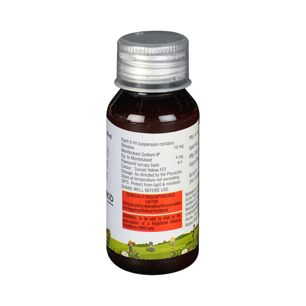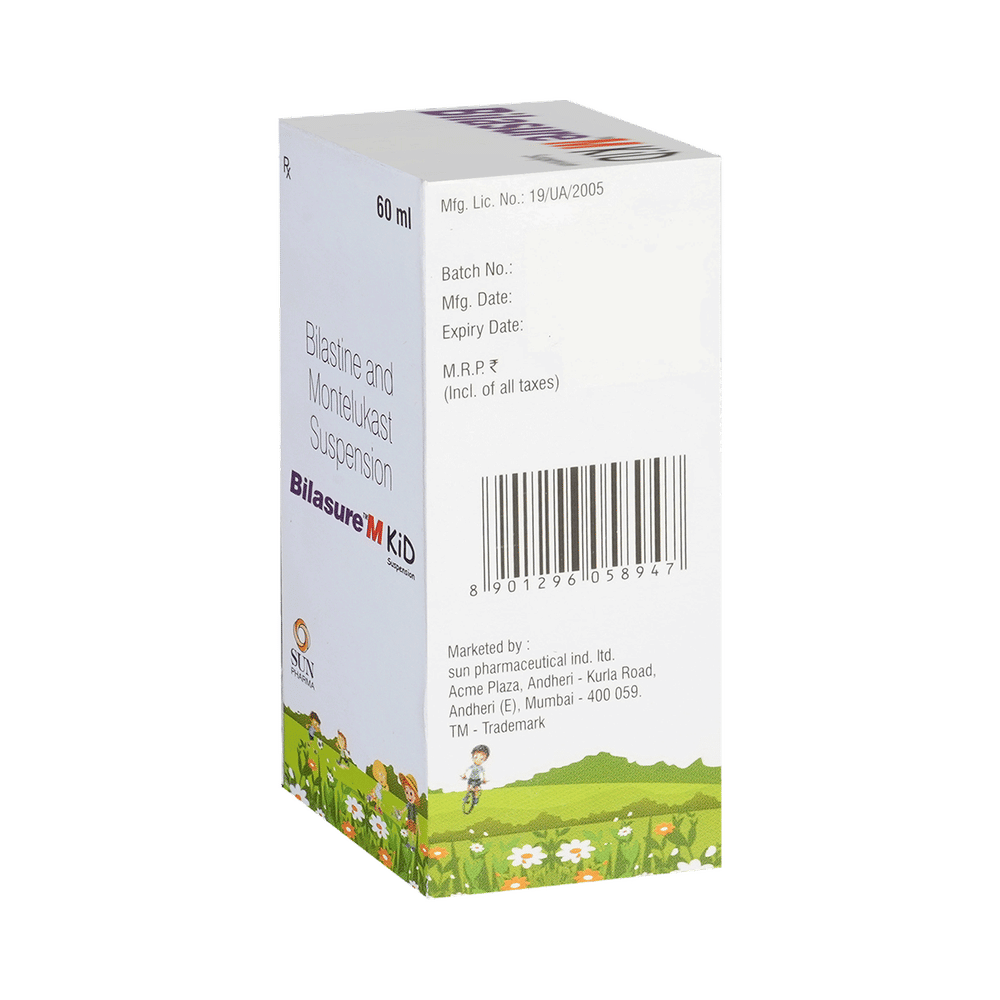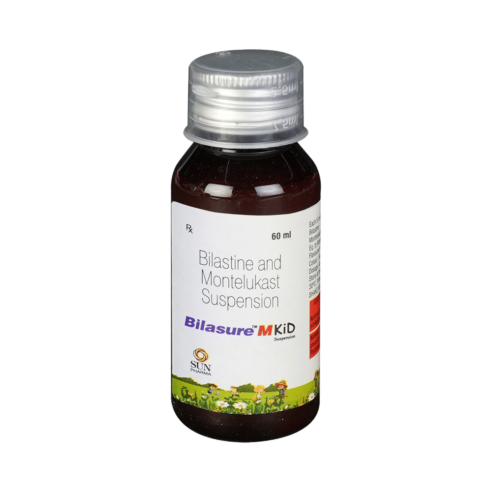 Bilasure M Kid Oral Suspension is a combination medicine used to treat allergic rhinitis, commonly known as hay fever. It helps relieve symptoms like sneezing, runny or blocked nose, itching, and watery eyes. It provides effective relief from allergy symptoms and improves breathing. To get the best results, take Bilasure M Kid Oral Suspension exactly as prescribed by your doctor. It is usually taken once daily on an empty stomach, at least one hour before or two hours after meals, as food can affect its absorption. Avoid skipping doses, and do not stop the medication abruptly without consulting your doctor. To maximize its benefits, stay away from known allergens, keep your living environment dust-free, and maintain proper hydration.Common side effects of Bilasure M Kid Oral Suspension include headache, cough, fatigue, fever, abdominal pain, diarrhea, drowsiness, and otitis media. These symptoms are usually mild and go away on their own. If any of these side effects persist or bother you, let your doctor know. To reduce drowsiness, avoid alcohol and ensure you get enough rest.While on Bilasure M Kid Oral Suspension, do not drive or operate heavy machinery as it can cause dizziness or sleepiness. Pregnant or breastfeeding women should consult their doctor before using this medicine. If you have liver or kidney problems, asthma, or a history of mental health conditions, inform your doctor before starting the treatment.