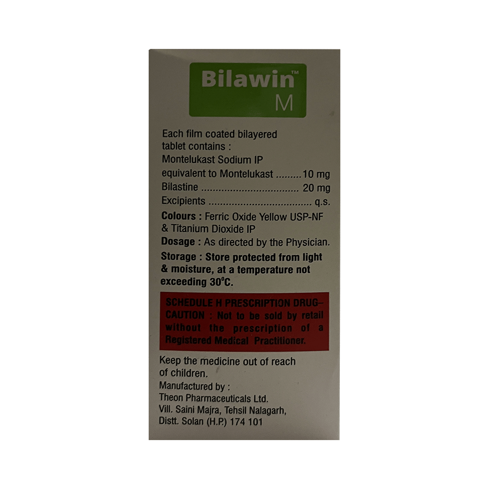 Bilawin-M Tablet is a combination medicine used to treat allergic rhinitis, commonly known as hay fever. It helps relieve symptoms like sneezing, runny or blocked nose, itching, and watery eyes. It provides effective relief from allergy symptoms and improves breathing. To get the best results, take Bilawin-M Tablet exactly as prescribed by your doctor. It is usually taken once daily on an empty stomach, at least one hour before or two hours after meals, as food can affect its absorption. Avoid skipping doses, and do not stop the medication abruptly without consulting your doctor. To maximize its benefits, stay away from known allergens, keep your living environment dust-free, and maintain proper hydration.Common side effects of Bilawin-M Tablet include headache, cough, fatigue, fever, abdominal pain, diarrhea, drowsiness, and otitis media. These symptoms are usually mild and go away on their own. If any of these side effects persist or bother you, let your doctor know. To reduce drowsiness, avoid alcohol and ensure you get enough rest.While on Bilawin-M Tablet, do not drive or operate heavy machinery as it can cause dizziness or sleepiness. Pregnant or breastfeeding women should consult their doctor before using this medicine. If you have liver or kidney problems, asthma, or a history of mental health conditions, inform your doctor before starting the treatment.