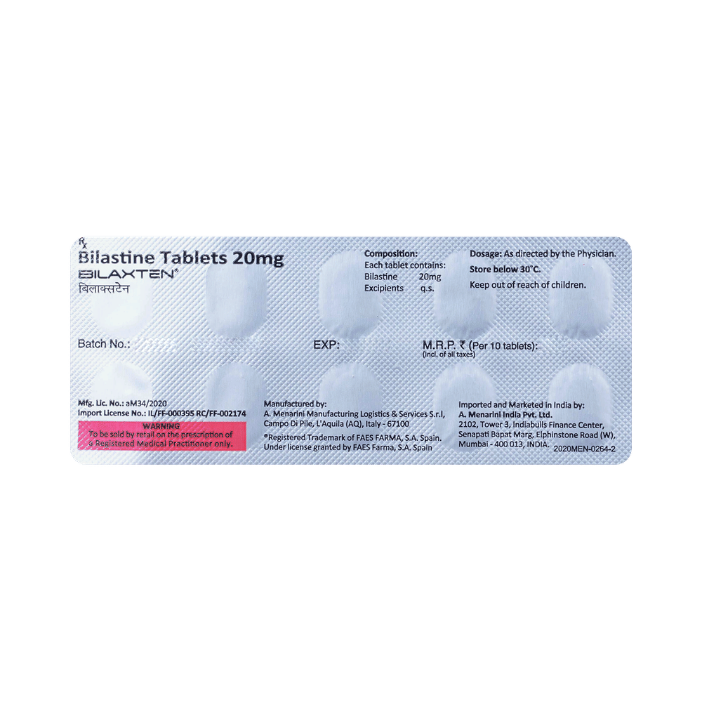 Bilaxten Tablet is an antiallergic medication. It treats allergy symptoms such as such as itching, swelling, and rashes by blocking the effects of a chemical messenger (histamine) in the body.