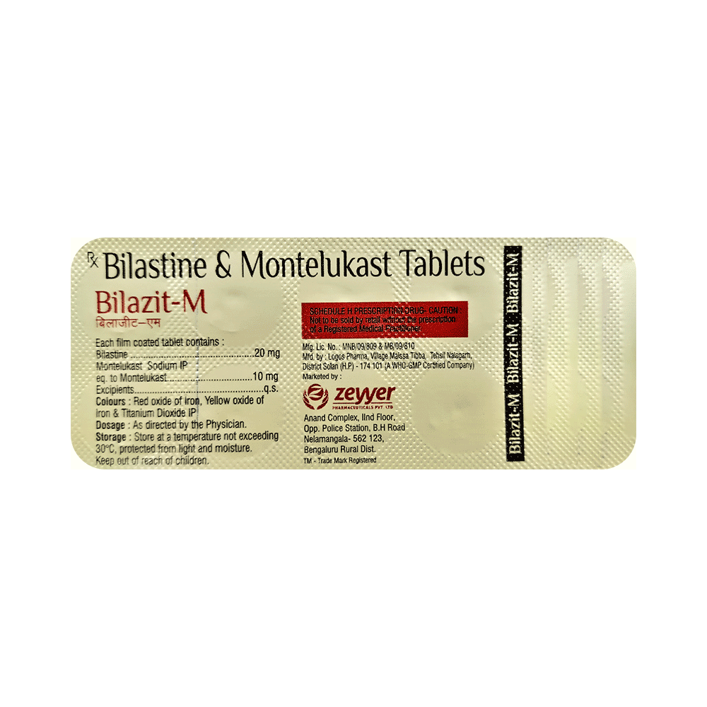 In Treatment of Allergic conditionsBilazit-M Tablet provides relief from allergic symptoms such as blocked or runny nose, sneezing and itchy or watery eyes caused by seasonal hay fever (allergic rhinitis), seasonal allergies, and allergies. It works by reducing certain substances in the body that are responsible for the allergic symptoms. Bilazit-M Tablet reduces swelling in the airways and gives relief from the symptoms of asthma. In Treatment of Allergic rhinitisBilazit-M Tablet provides relief from allergic symptoms such as blocked or runny nose, sneezing, and itchy or watery eyes caused by seasonal hay fever (allergic rhinitis), seasonal allergies, and other allergies. It works by reducing certain substances in the body that are responsible for the allergic symptoms. Bilazit-M Tablet reduces swelling in the airways and gives relief from allergic reactions.show moreshow less