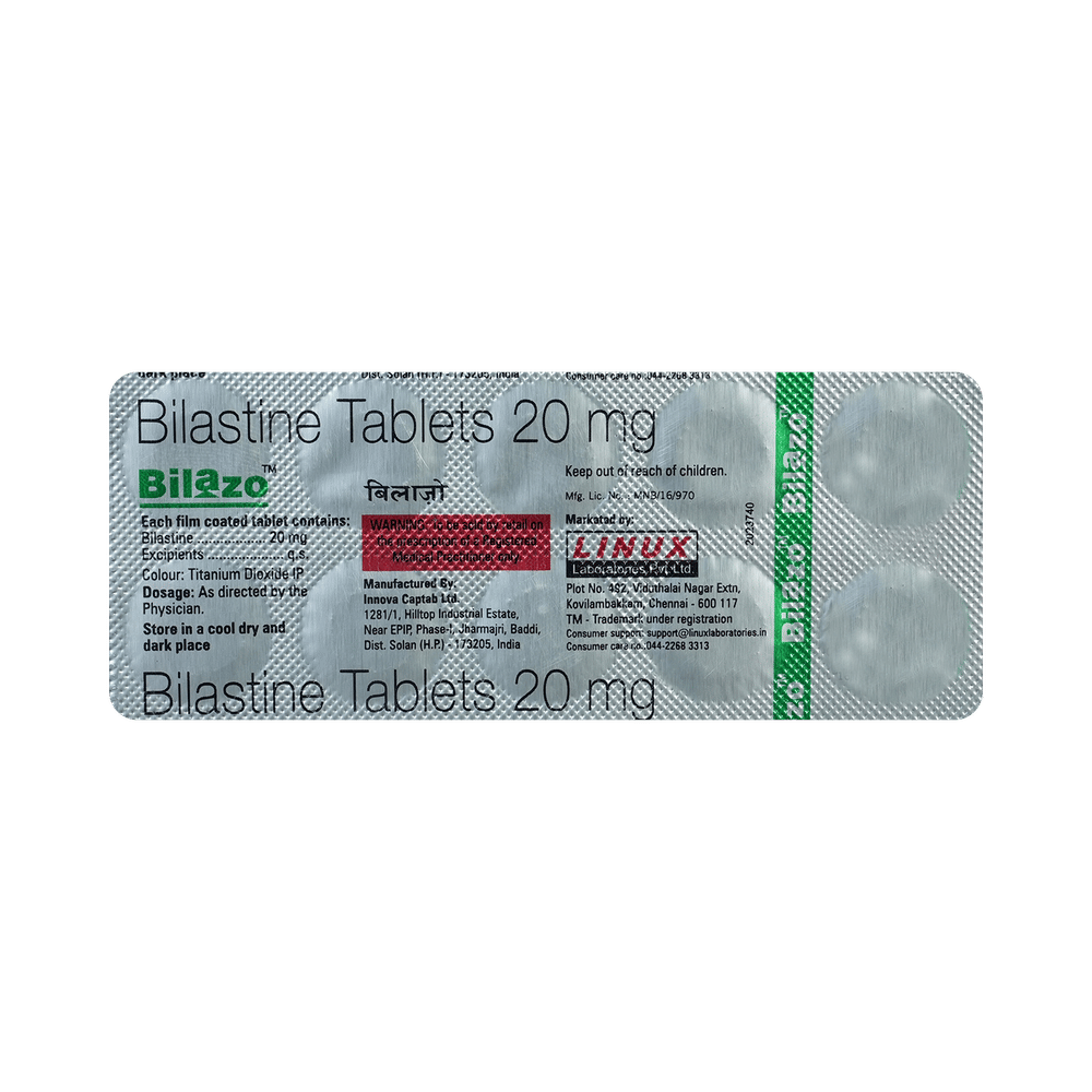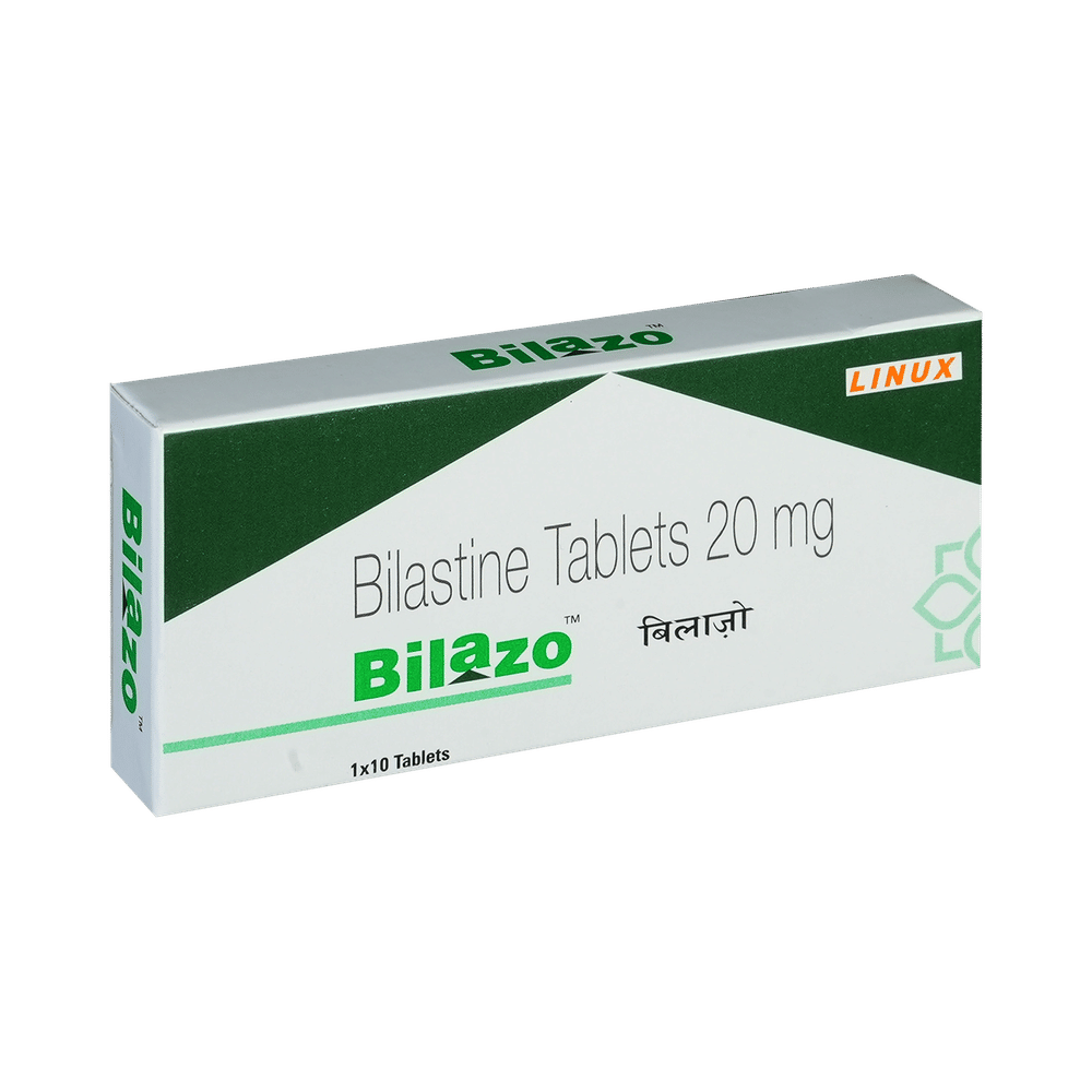 Bilazo Tablet belongs to a group of medicines known as antihistamines. It is used in the treatment of allergy symptoms such as runny nose, stuffy nose, sneezing, watery eyes, and congestion or stuffiness. Bilazo Tablet can be taken one hour before or two hours after food, but take it at the same time to get the most benefit. It should be taken as your doctor's advice. The dose and how often you take it depend on what you are taking it for. Your doctor will decide how much you need to improve your symptoms. Remember, dosage is decided on the basis of the type of medicine (tablet or syrup ), age, and present medical condition of the person. You should take this medicine for as long as it is prescribed for you. If you do not observe any improvement in the symptoms, consult with the doctor.The most common side effects of this medicine include headaches and drowsiness. If these bother you or appear serious, let your doctor know. There may be ways of reducing or preventing them. Generally, it is advised to drink plenty of fluids while on treatment with this medicine. To overcome dizziness, avoid driving or attention-seeking activities until you know how the medicine affects you.Before taking this medicine, let your doctor know if you are pregnant or breastfeeding. Your doctor should also know about all other medicines you are taking as many of these may make this medicine less effective or change the way it works. You must avoid fruit juice before taking the medicine.