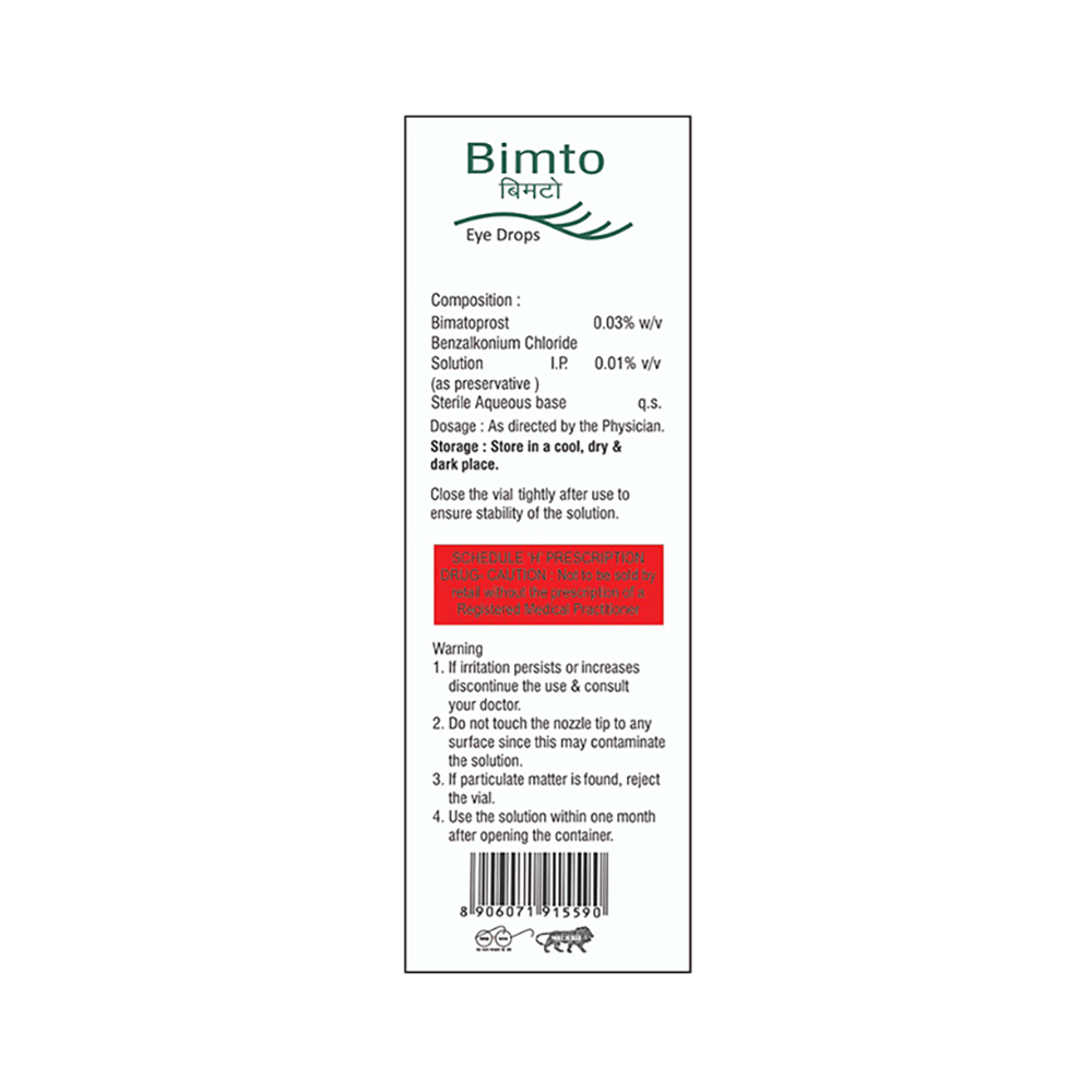 In GlaucomaBimto Eye Drop helps reduce pressure in your eyes (ocular hypertension) that can lead to an illness called glaucoma. It may be used alone or with other eye drops. Do not use it too often as that can make it less effective. You should only use it in the affected eye and take it regularly as prescribed by your doctor. If you stop taking it, the pressure in your eye will not be controlled. This could lead to a loss of sight.In Ocular hypertensionBimto Eye Drop belongs to a group of medicines called prostaglandin analogue. It is used to reduce pressure in your eyes. It increases the flow of fluid from inside the eye into the bloodstream thereby lowering the increased eye pressure. If the pressure in your eye is too high, it can damage your sight. Take it regularly as prescribed by your doctor. If you stop taking it, the pressure in your eye will not be controlled.show moreshow less