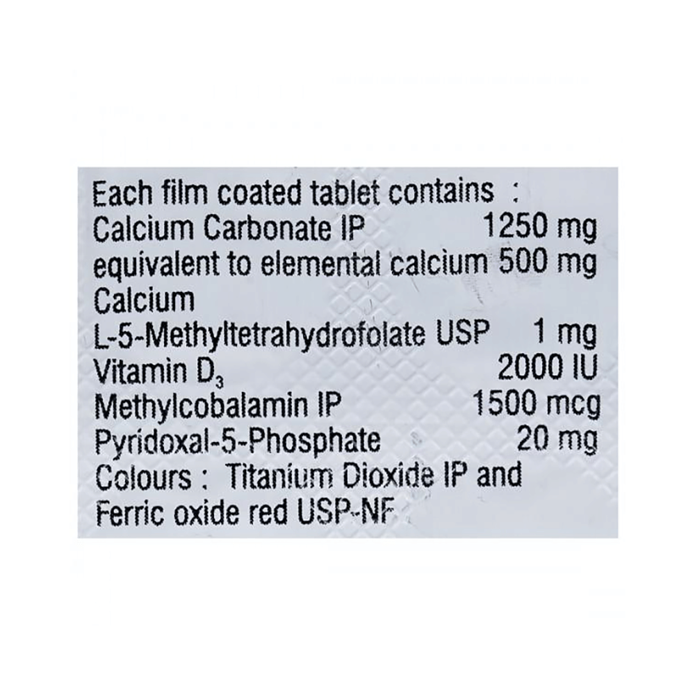 Salt Composition: Calcium Carbonate (1250mg) + Vitamin D3 (2000IU) + Methylcobalamin (1500mcg) + L-Methyl Folate Calcium (1mg) + Pyridoxal-5-phosphate (20mg)