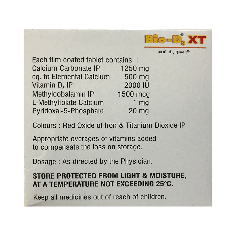 Bio-D3 XT Tablet is a combination of five medicines : Calcium Carbonate, Vitamin D3, Methylcobalamin, L-Methyl Folate Calcium, and Pyridoxal-5-phosphate. Calcium carbonate is a dietary supplement used when the amount of calcium taken in the diet is not enough. Vitamin D3 is a form of vitamin D. It raises vitamin D levels in your blood. This in turn raises calcium levels in your blood by helping you absorb more calcium from food. Methylcobalamin is a form of vitamin B12 that restores its level in the body thereby helping in treating certain anemias and nerve problems. L-Methyl Folate Calcium and Pyridoxal-5-phosphate are nutritional supplements that provide essential nutrients to our body and improve overall health.
