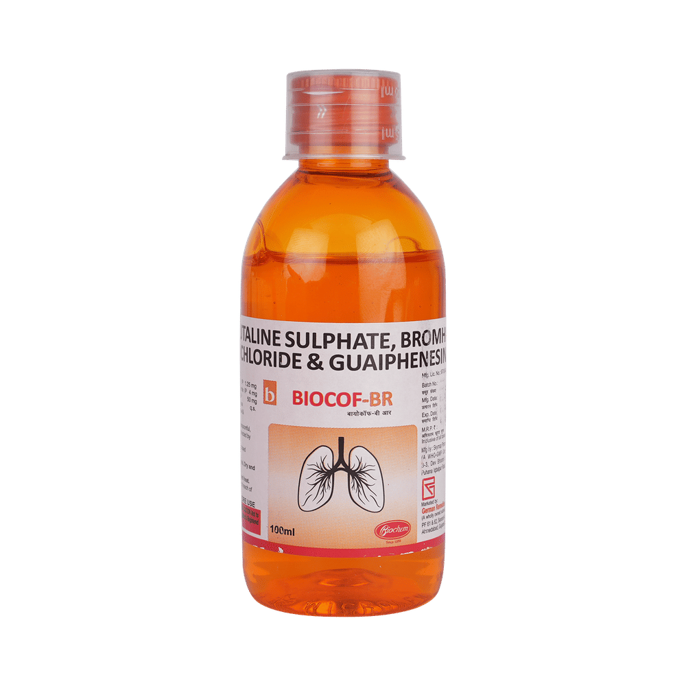 Biocof-BR Syrup is used in the treatment of cough with mucus. It thins mucus in the nose, windpipe, and lungs, making it easier to cough out. It also provides relief from a runny nose, sneezing, itching, and watery eyes. Biocof-BR Syrup is taken with or without food in a dose and duration as advised by the doctor. The dose you are given will depend on your condition and how you respond to the medicine. You should keep taking this medicine for as long as your doctor recommends. If you stop treatment too early, your symptoms may come back, and your condition may worsen. Let your doctor know about all other medications you are taking, as some may affect or be affected by this medicine.The most common side effects are nausea, diarrhea, bloating, indigestion, vomiting, stomach pain, sweating, headache, skin rash, tremor, and increased heart rate. Most of these are temporary and usually resolve with time. Contact your doctor straightaway if you are at all concerned about any of these side effects. This medicine can also cause sleepiness, so do not drive or do anything that requires mental focus until you know how this medicine affects you. Avoid drinking alcohol while taking this medicine, as it can make sleepiness worse.Never support self-medication or recommend your medicine to another person. It is beneficial to have plenty of fluids while taking this medication. Before taking this medicine, you should tell your doctor if you are pregnant, planning pregnancy, or breastfeeding. You should also tell your doctor if you have any kidney or liver diseases so that your doctor can prescribe a suitable dose for you.