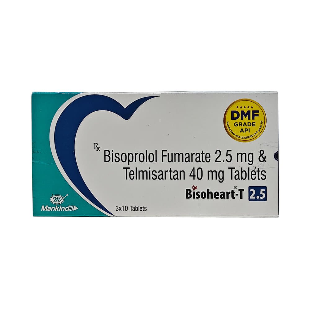 Bisoheart-T 2.5mg/40mg Tablet is a combination medicine used in the treatment of hypertension (high blood pressure). It works by relaxing the blood vessels and making the heart more efficient at pumping blood throughout the body. It is advised to take Bisoheart-T 2.5mg/40mg Tablet at a fixed time each day to maintain consistent levels of medicine in the blood. Keep taking it for as long as advised by your doctor. Even if you feel well, do not stop this medicine on your own because high blood pressure often has no symptoms. If you stop taking it, your condition may get worse. Keeping active with regular exercise, reducing your weight and eating a healthy diet will also help control your blood pressure. Follow your doctor’s advice while taking this medicine.Some common side effects of this medicine include headache, cold extremities, slow heart rate, numbness of extremities, decreased blood pressure, weakness, and increased potassium level in blood. It is advised to avoid potassium rich food and supplements while taking this medicine. It may cause dizziness, avoid driving or rise slowly from the sitting position. You may be asked for regular monitoring of blood pressure and electrolytes level in the blood during the treatment.Before taking it, let your doctor know if you have any liver or kidney problems. Pregnant or breastfeeding women should also consult their doctor for advice before taking this medicine. You also need to tell your doctor what other medicines you are taking especially those used to treat high blood pressure or heart conditions.