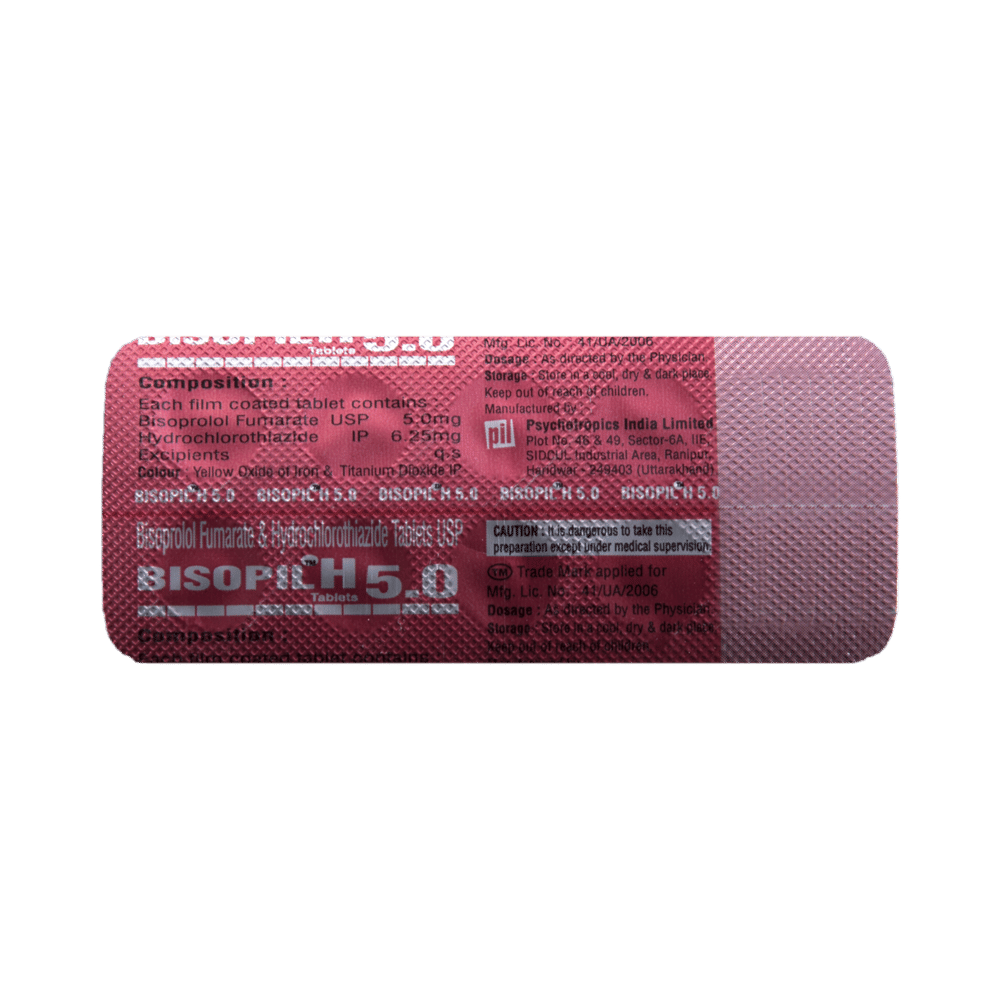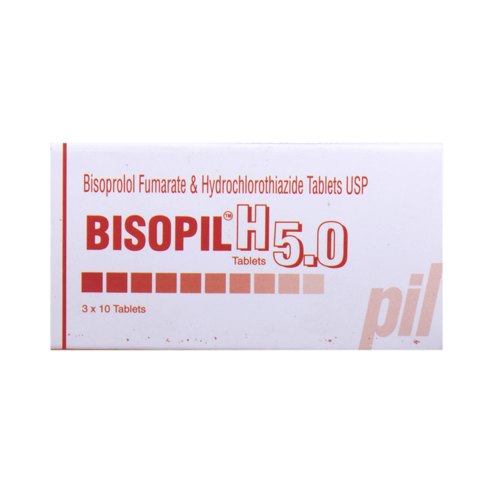 Bisopil H 5 Tablet is a combination of two medicines used to treat hypertension (high blood pressure). It helps to control blood pressure when a single medication is not effective. It also helps to reduce chances of any future heart attack and stroke. Bisopil H 5 Tablet is taken with or without food preferably in the morning to avoid frequent urination at night. Keep taking it for as long as advised by your doctor. Even if you feel well, do not stop this medicine on your own because high blood pressure often has no symptoms. If you stop taking it, your condition may get worse. Keeping active with regular exercise, reducing your weight and eating a healthy diet will also help control your blood pressure. Follow your doctor’s advice while taking this medicine.Common side effects of this medicine include nausea, vomiting, constipation, diarrhea, decreased blood pressure, and fatigue. Consult your doctor If any of these bother you, or get worse, or Do not go away. Drink plenty of fluids while taking medicine to overcome muscle weakness, dry mouth and extreme thirst. Dizziness or headache may occur due to low blood pressure but this gets better with time.Before taking it, let your doctor know if you have any liver or kidney problems. Pregnant or breastfeeding women should also consult their doctor for advice before taking this medicine. You also need to tell your doctor what other medicines you are taking especially those used to treat high blood pressure or heart conditions. You should have your blood pressure, kidney function, blood sugar level and the levels of salts such as potassium or magnesium checked regularly to make sure that this medicine is working properly.