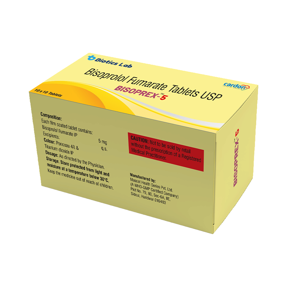 In Treatment of Hypertension (high blood pressure)Bisoprex 5 Tablet blocks the effects of some chemicals on your heart and blood vessels. It slows down your heart rate and helps the heart to beat with less force. This lowers your blood pressure and helps in reducing your risk of having a stroke, a heart attack, other heart problems, or kidney problems in the future. This medicine needs to be taken regularly to be effective, so keep taking it even if you feel well. Do not stop without talking to your doctor.In Treatment of Angina (heart-related chest pain)Bisoprex 5 Tablet relaxes the blood vessels so that blood can flow more easily around your body and makes sure that your heart is getting a good supply of oxygen. This makes it less likely that you will suffer chest pain caused by angina. This medicine can help increase your ability to exercise and go about your daily life more easily by reducing the frequency of angina attacks. You should take it regularly and as long as it is prescribed for it to work effectively.In Treatment of ArrhythmiaBisoprex 5 Tablet is used to stabilize heart rhythms (particularly atrial fibrillation). It helps in normalizing an abnormal heart rhythm, preventing it from occurring in the first place, or slowing down the heart rate during an episode.In Prevention of Heart attackBisoprex 5 Tablet helps lower your blood pressure and make it easier for your heart to pump blood around your body. This reduces the chances of you having a heart attack. It can also reduce the risk of dying if it is given immediately after a heart attack. This medicine needs to be taken regularly to be effective, so keep taking it even if you feel well. Do not stop without talking to your doctor.show moreshow less