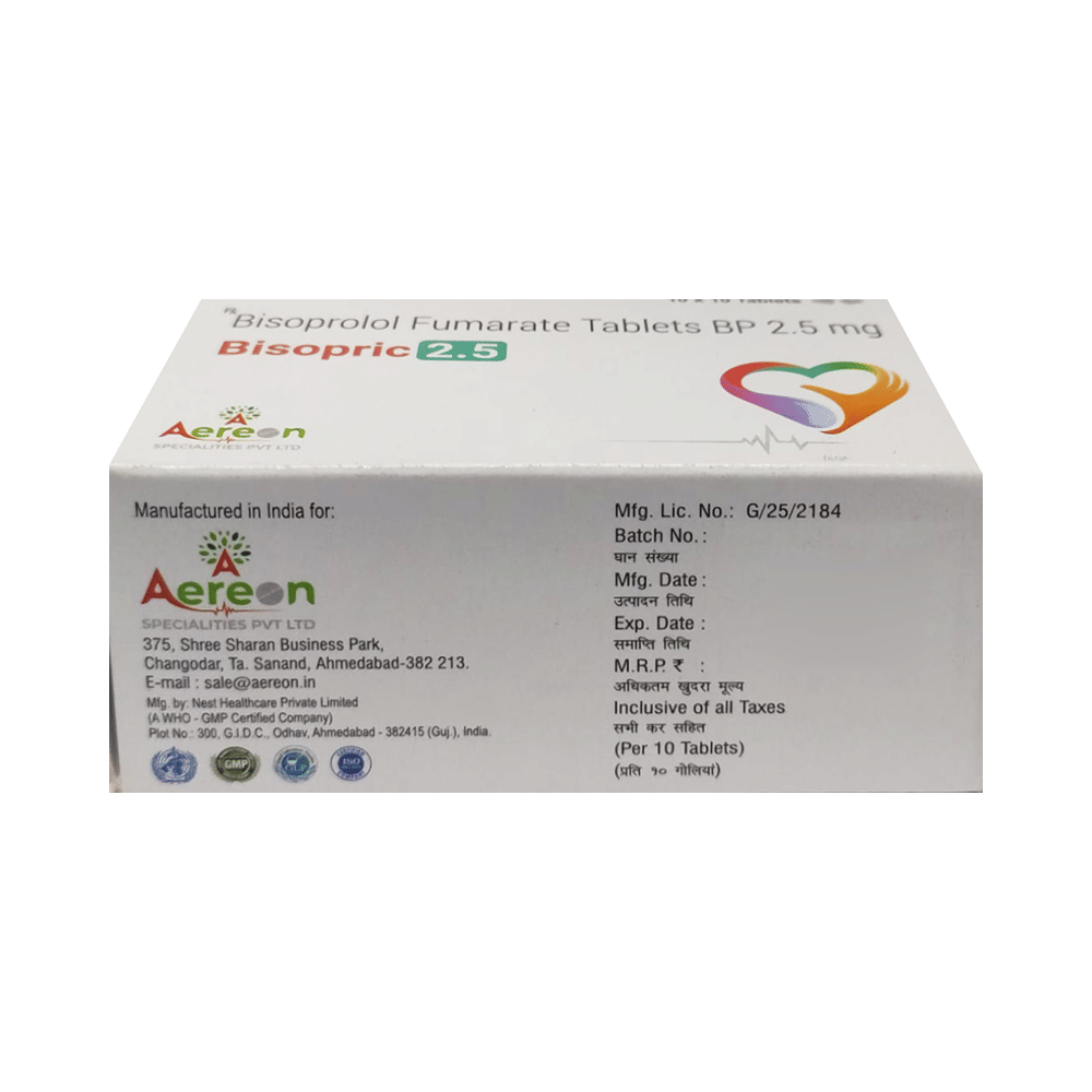 Bisopric 2.5 Tablet is used to manage heart failure, particularly in patients recovering from a heart attack. It also treats high blood pressure (hypertension), angina (chest pain), and arrhythmia (irregular rhythms). It improves heart function, reduces strain, and lowers the risk of future cardiac events. Bisopric 2.5 Tablet helps improve cardiac output and prevent heart failure progression. It helps regulate blood pressure, enhances blood flow, and supports overall cardiovascular health. This makes it essential to post-myocardial infarction (heart attack) care, ensuring long-term heart protection. It may also be used to relieve the symptoms caused by an overactive thyroid gland.Your doctor may prescribe Bisopric 2.5 Tablet as part of a comprehensive heart care plan, often alongside lifestyle modifications like a heart-healthy diet, regular exercise, and smoking cessation. It is important to take Bisopric 2.5 Tablet exactly as directed by your doctor. Do not stop taking this medication without consulting your doctor, as sudden discontinuation may increase heart risks.Common side effects of Bisopric 2.5 Tablet include fatigue, headache, slow heart rate, dizziness, and nausea. These are usually mild and short-lived. It may also cause shortness of breath or low blood pressure in some people. To reduce the risk of side effects, your doctor may start the medicine at a low dose and gradually increase it. Consult your doctor if the side effects bother you or do not go away.Before taking Bisopric 2.5 Tablet, let your doctor know if you have any liver problems. It may also not be suitable for people who have a slow heart rate, severe circulation problems, severe heart failure, or low blood pressure. Pregnant or breastfeeding women should also consult their doctor before taking it. Have your blood pressure checked regularly to ensure the efficacy of the treatment. Avoid drinking alcohol as it may increase certain side effects.
