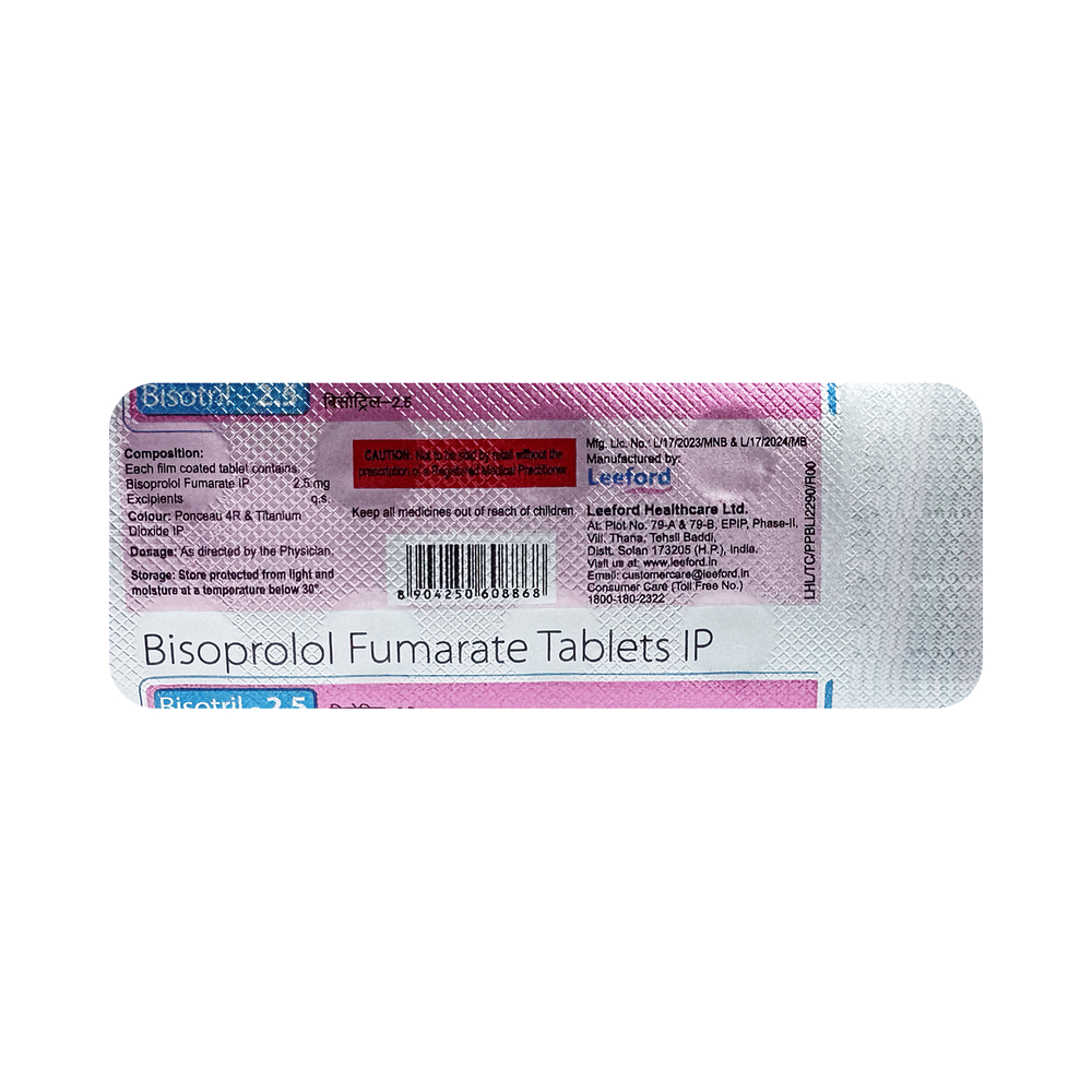 BISOtril 2.5 Tablet is used to manage heart failure, particularly in patients recovering from a heart attack. It also treats high blood pressure (hypertension), angina (chest pain), and arrhythmia (irregular rhythms). It improves heart function, reduces strain, and lowers the risk of future cardiac events. BISOtril 2.5 Tablet helps improve cardiac output and prevent heart failure progression. It helps regulate blood pressure, enhances blood flow, and supports overall cardiovascular health. This makes it essential to post-myocardial infarction (heart attack) care, ensuring long-term heart protection. It may also be used to relieve the symptoms caused by an overactive thyroid gland.Your doctor may prescribe BISOtril 2.5 Tablet as part of a comprehensive heart care plan, often alongside lifestyle modifications like a heart-healthy diet, regular exercise, and smoking cessation. It is important to take BISOtril 2.5 Tablet exactly as directed by your doctor. Do not stop taking this medication without consulting your doctor, as sudden discontinuation may increase heart risks.Common side effects of BISOtril 2.5 Tablet include fatigue, headache, slow heart rate, dizziness, and nausea. These are usually mild and short-lived. It may also cause shortness of breath or low blood pressure in some people. To reduce the risk of side effects, your doctor may start the medicine at a low dose and gradually increase it. Consult your doctor if the side effects bother you or do not go away.Before taking BISOtril 2.5 Tablet, let your doctor know if you have any liver problems. It may also not be suitable for people who have a slow heart rate, severe circulation problems, severe heart failure, or low blood pressure. Pregnant or breastfeeding women should also consult their doctor before taking it. Have your blood pressure checked regularly to ensure the efficacy of the treatment. Avoid drinking alcohol as it may increase certain side effects.