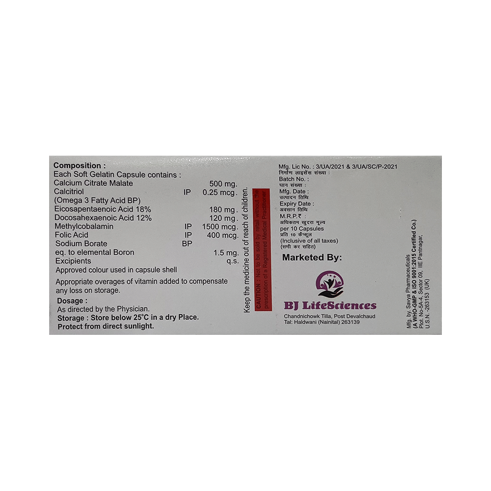 Salt Composition: Calcitriol (0.25mcg) + Calcium Carbonate (500mg) + Omega-3 fatty acid (300mg) + Methylcobalamin (1500mcg) + Folic Acid (400mcg) + Boron (1.5mg)