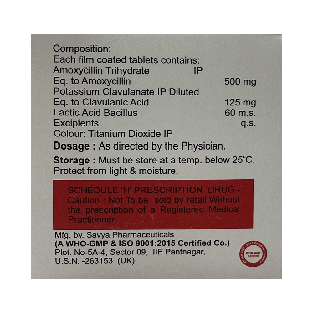 Salt Composition: Amoxycillin (500mg) + Clavulanic Acid (125mg) + Lactobacillus (60Million spores)