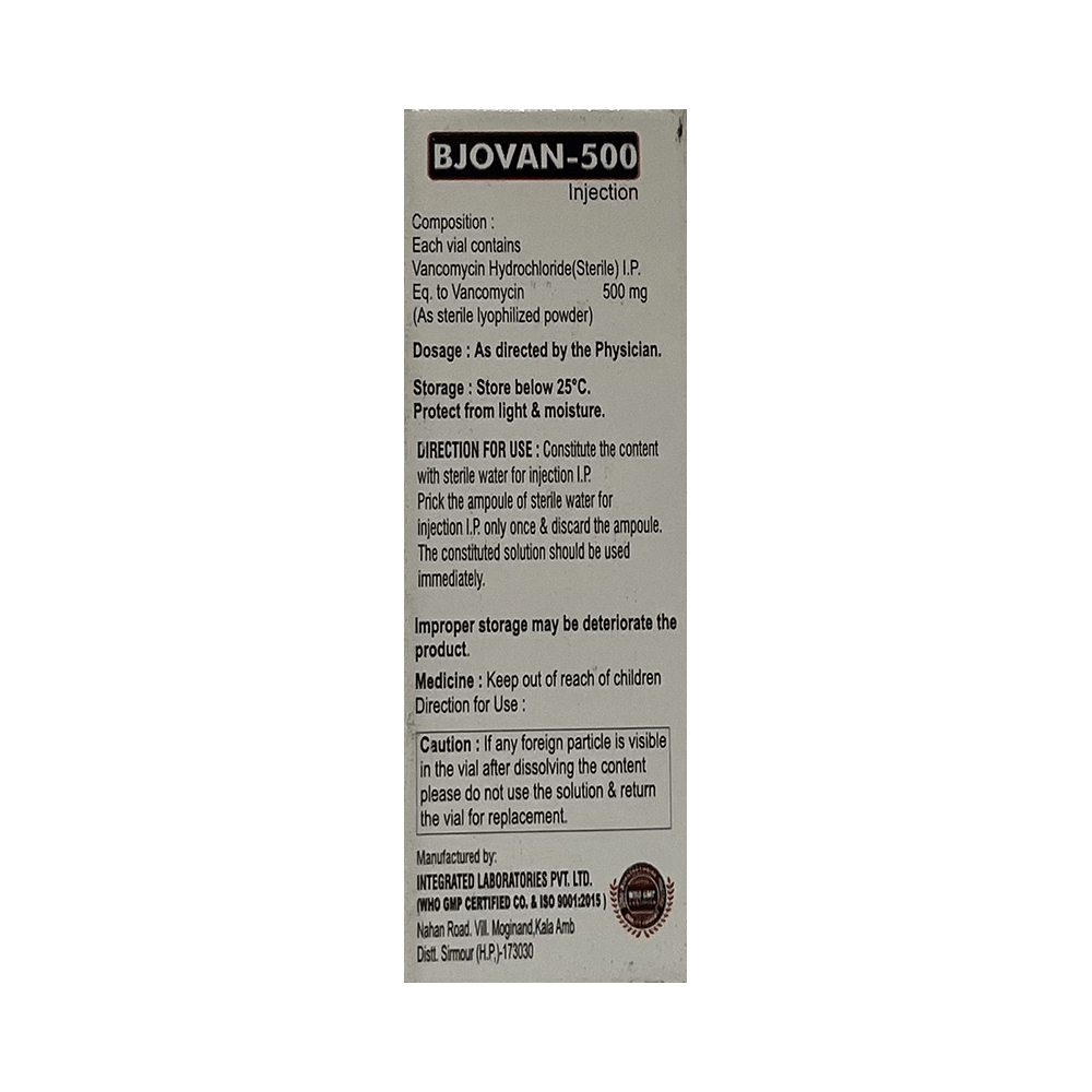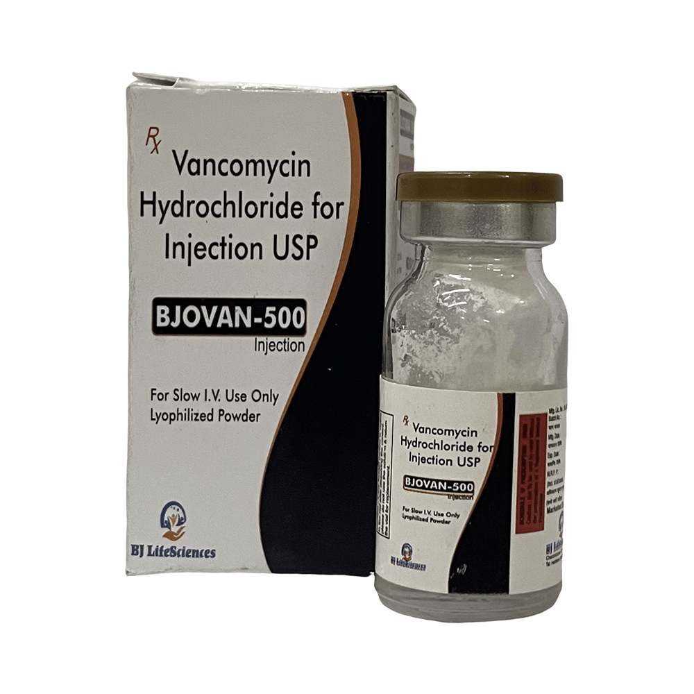 Bjovan 500 Injection is an antibiotic used in the treatment of severe bacterial infections in hospitalized patients. It is effective against infections of the respiratory tract (e.g. pneumonia), urinary tract, skin and soft tissues, bones and joints, heart, blood, and others. Bjovan 500 Injection is also used for the prevention of infection in some high-risk patients undergoing surgical procedures. It works by stopping the growth of bacteria and is useful for treating adults as well as children. It is a narrow-spectrum antibiotic that only covers the gram-positive type of bacteria. This medicine is administered slowly by a drip (infusion) into a vein, under the supervision of a healthcare professional. A rapid infusion can lead to reactions such as low blood pressure, wheezing, shortness of breath, or itching. It may also be combined with other antibiotics to treat additional types of bacteria.Some people may develop local injection site reactions like pain, swelling, and redness. However, these are usually minor and temporary. Other side effects like wheezing, kidney (renal) injury, shortness of breath, flushing (sense of warmth in the face, ears, neck, and trunk) and decreased blood pressure may be seen occasionally.Inform your doctor if you have a history of an allergic reaction to this medication in the past. Your doctor may regularly monitor your kidney function and your hearing while you are taking this medicine. Some people may be advised blood tests to check the level of this medicine in their blood. Consult your doctor if you are pregnant or breastfeeding before taking this medicine.
