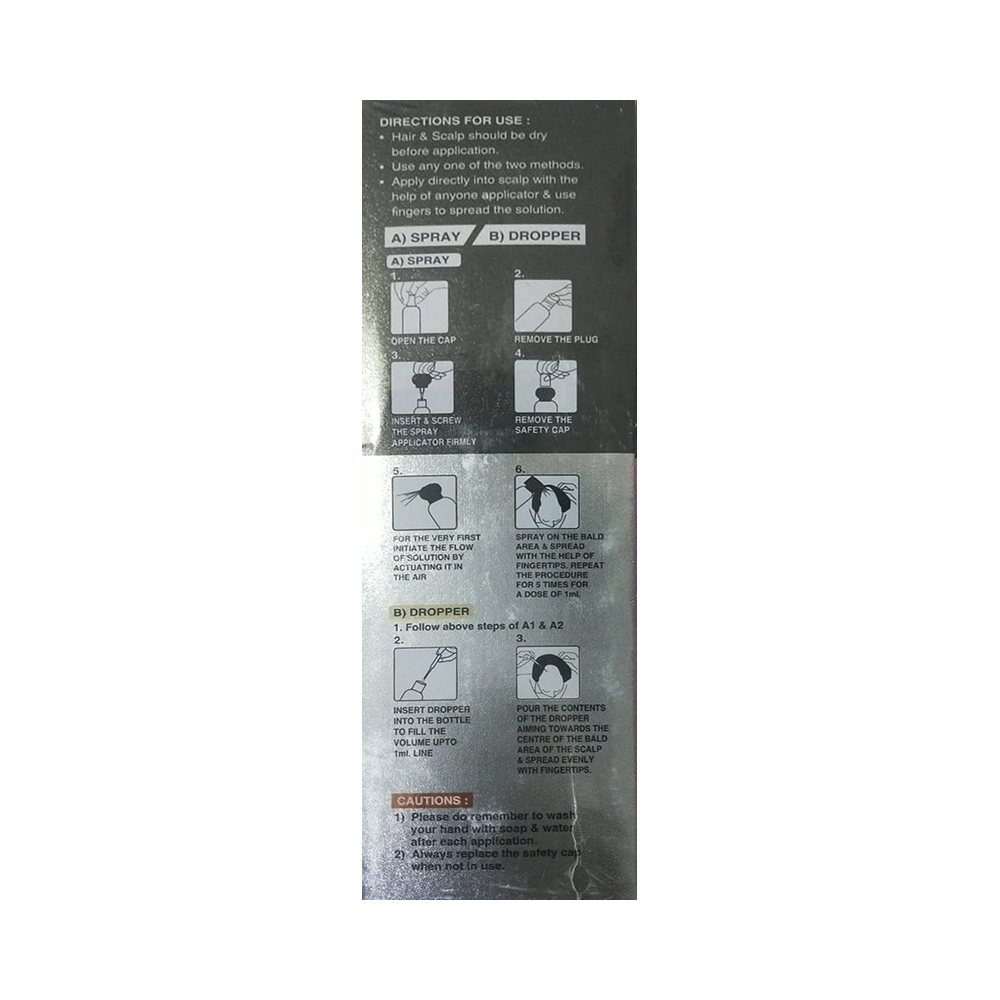 BlackCrown Forte Spray/Solution is a combination medicine used in the treatment of hair loss in men. It works by increasing blood flow to the hair follicles, which further prevents hair loss and stimulates re-growth, resulting in longer, thicker, and increased numbers of hair. Use BlackCrown Forte Spray/Solution in the dose and duration as prescribed by your doctor or as instructed on the label. Clean and dry your scalp before using it. It may take several months before you notice any hair growth. The first growth could be soft, colorless, and barely visible. Use it in the exact dose and duration as prescribed by your doctor. Using more than recommended will not speed up hair growth and may increase the likelihood of side effects. Use it for as long as the doctor has prescribed to maintain proper hair growth. If your condition does not improve after using it for 4 to 6 months, tell your doctor. This medicine is to be used only by men and is not indicated in women.Common side effects of this medicine include application site reactions, dry skin, impotence, decreased libido, ejaculation disorders, breast enlargement, breast tenderness in males, and skin rash. In case of accidental contact with other parts of the body, it may cause excessive hair growth. If you get it in your eyes, mouth, or broken skin, rinse thoroughly with plenty of water. Talk to your doctor if you are bothered by side effects or they do not go away.To ensure its safety, before using this medicine, let your doctor know if you have any problems with your heart. Additionally, inform your doctor about all the medicines you are taking. Pregnant, potentially pregnant, or breastfeeding women should not handle this medicine because of the possibility of absorption of finasteride. As it may cause potential harm to a male baby or fetus.