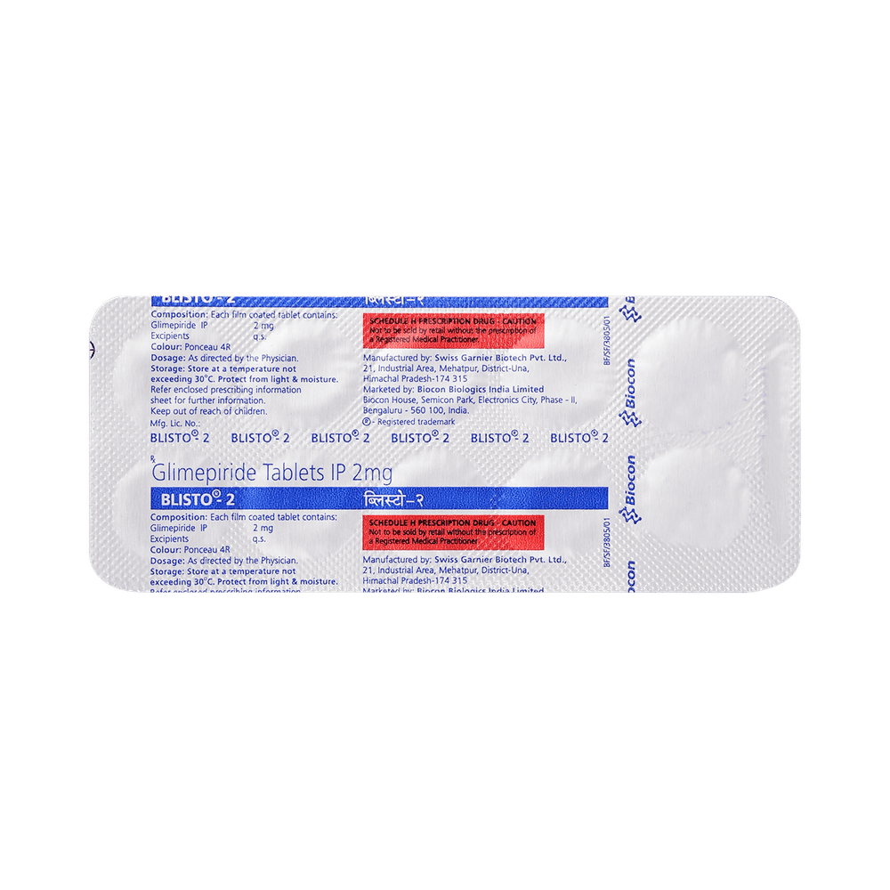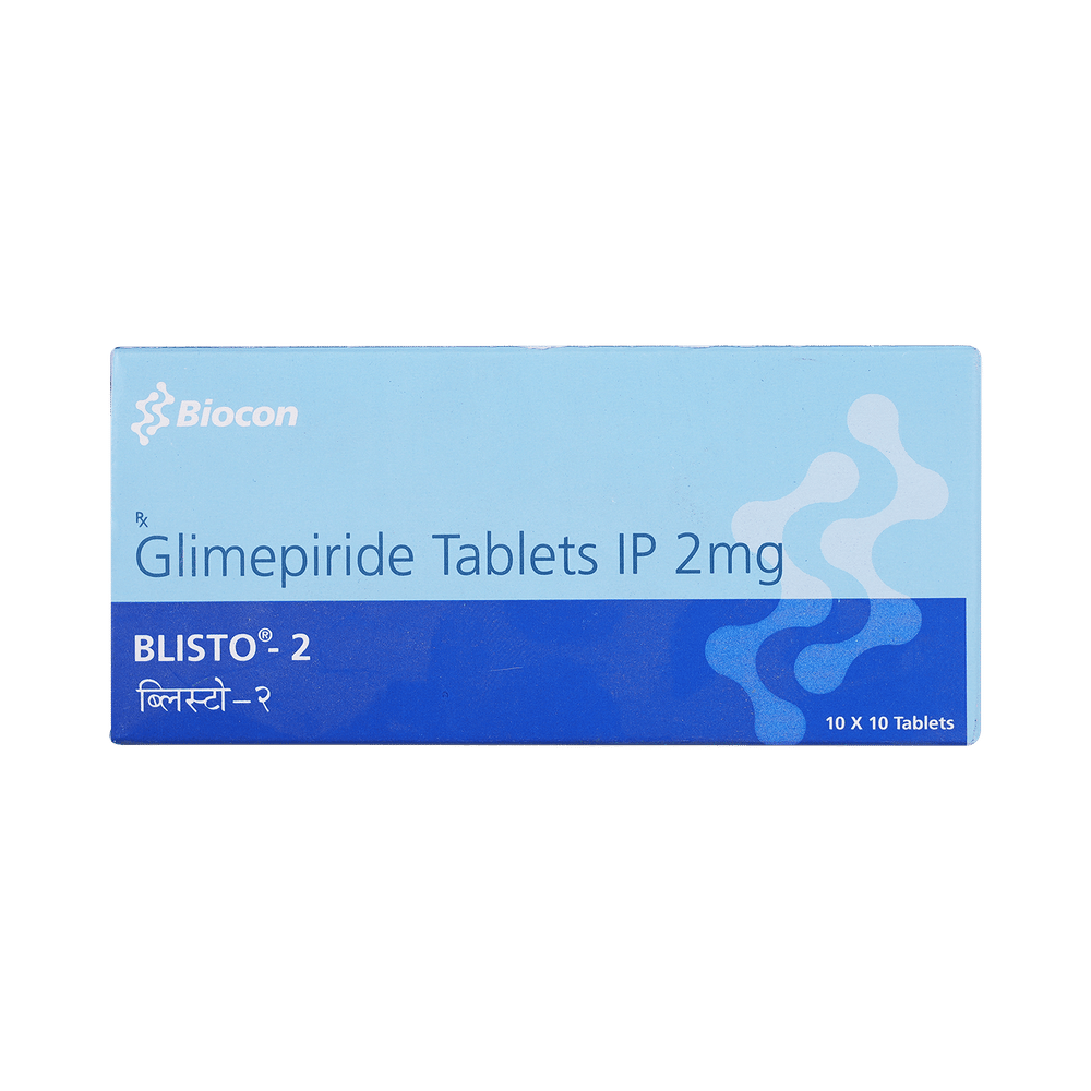 Blisto 2 Tablet belongs to a group of medicines called sulfonylureas and is used to treat type 2 diabetes mellitus in adults. It helps control blood sugar levels in people with diabetes thereby preventing serious complications of diabetes such as kidney damage and blindness. Blisto 2 Tablet may be used alone or along with other medicines. It should be taken just before or with the first meal of the day. Take it regularly at the same time each day to get the maximum benefit. Your doctor will decide what dose is best for you and this may change from time to time according to your blood sugar levels.Keep taking Blisto 2 Tablet, even if you feel well or your blood sugar levels are controlled. If you stop it without consulting your doctor, your blood sugar levels could rise to put you at risk of diabetes complications such as kidney damage, blindness, nerve problems, and loss of limbs. Remember that it is only part of a treatment program that should also include a healthy diet, regular exercise, and weight reduction as advised by your doctor. Your lifestyle plays a big part in controlling diabetes.The most common side effects of taking Blisto 2 Tablet include low blood sugar levels (hypoglycemia), nausea, headache, weakness, and dizziness. Make sure you recognize the signs of having low blood sugar levels, such as sweating, dizziness, headache, and shaking, and know how to deal with them. To prevent this, it is important to have regular meals and always carry a fast-acting source of glucose such as sugary food or fruit juice with you. Drinking alcohol can also increase your risk of low blood sugar levels and hence should be avoided. Some people may experience an increase in weight with this medicine.You should not take Blisto 2 Tablet if you have type 1 diabetes mellitus, diabetic ketoacidosis (high levels of acid in your blood), or if you have severe kidney or liver disease. Before taking this medicine, tell your doctor if you have ever had heart disease, thyroid disease, or some hormonal conditions, as it may not be suitable. Pregnant or breastfeeding women should also consult their doctor before taking it. Your blood sugar levels should be checked regularly and your doctor may also advise blood tests to monitor your blood cell counts and liver function.