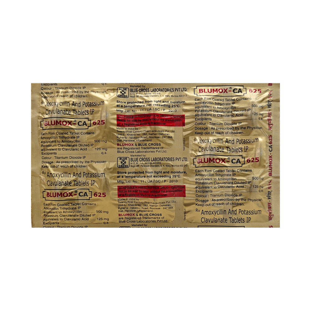 Blumox-CA 500mg/125mg Tablet is a combination of two medicines: Amoxycillin and Clavulanic Acid. Amoxycillin is an antibiotic. It works by preventing the formation of the bacterial protective covering, which is essential for the survival of bacteria. Clavulanic Acid is a beta-lactamase inhibitor that reduces resistance and enhances the activity of Amoxycillin against bacteria.