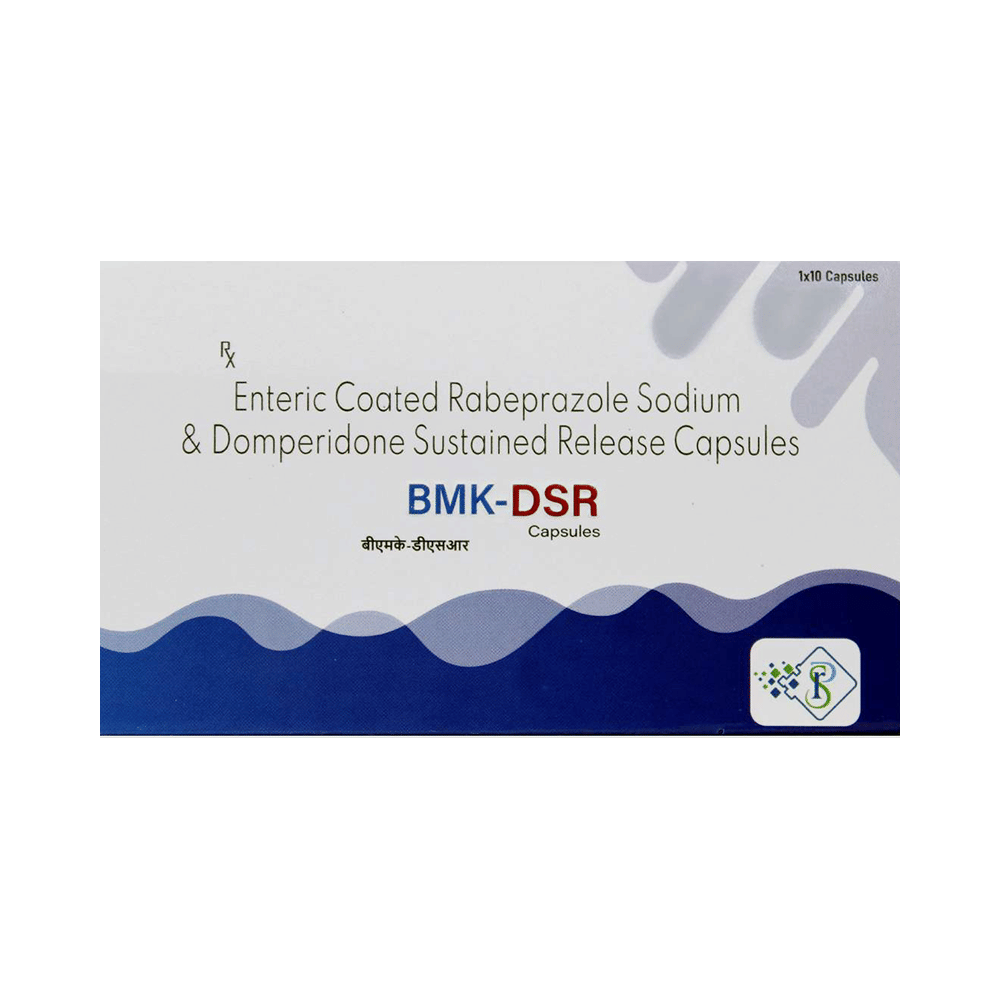 Bmk-DSR Capsule is a combination of two medicines: Domperidone and Rabeprazole. Domperidone is a prokinetic that works on the upper digestive tract to increase the movement of the stomach and intestines, allowing the food to move more easily through the stomach. Rabeprazole is a proton pump inhibitor (PPI) which works by reducing the amount of acid in the stomach, which helps in the relief of acid-related indigestion and heartburn.