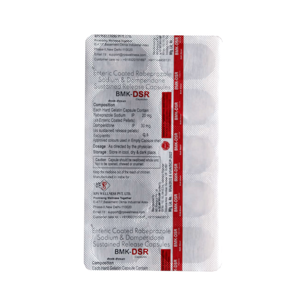 In Treatment of Gastroesophageal reflux disease (Acid reflux)Gastroesophageal reflux disease (GERD) is a chronic (long-term) condition in which there is an excess production of acid in the stomach. Bmk-DSR Capsule reduces the amount of acid your stomach makes and relieves the pain associated with heartburn and acid reflux. You should take it exactly as it is prescribed for it to be effective. Some simple lifestyle changes can help reduce the symptoms of GERD. Think about what foods trigger heartburn and try to avoid them; eat smaller, more frequent meals; try to lose weight if you are overweight, and try to find ways to relax. Do not eat within 3-4 hours of going to bed.In Treatment of Peptic ulcer diseasePeptic ulcer disease is a condition in which painful sores or ulcers develop in the inner lining of the stomach or gut (intestine). Bmk-DSR Capsule reduces the amount of acid your stomach makes which prevents further damage to the ulcer as it heals naturally. You may be given other medicines along with this medicine depending on what caused the ulcer. You need to keep taking the medicine as it is prescribed for it to be effective, even if the symptoms seem to disappear.show moreshow less