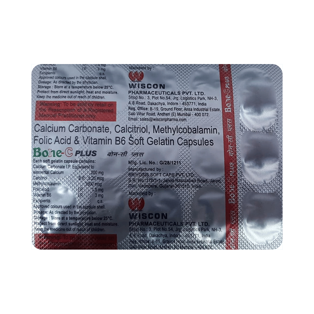 Bone-C Plus Capsule is a combination of five nutritional supplements. Calcium increases calcium deposition in the bones, which increases the density of the bones and makes them stronger. Calcitriol is a synthetic vitamin D that regulates the absorption of calcium in the body and strengthens the bones. Methylcobalamin is an active form of vitamin B12. This helps in proper cell growth and development, protein synthesis, and the production of blood cells (red and white blood cells). Folic Acid is also known as folate or vitamin B9. It helps in producing blood (hemoglobin) in the body. Vitamin B6 (Pyridoxine) is a vitamin nutritional supplement that regulates essential metabolic functions. Together, they help in managing nutritional deficiencies.