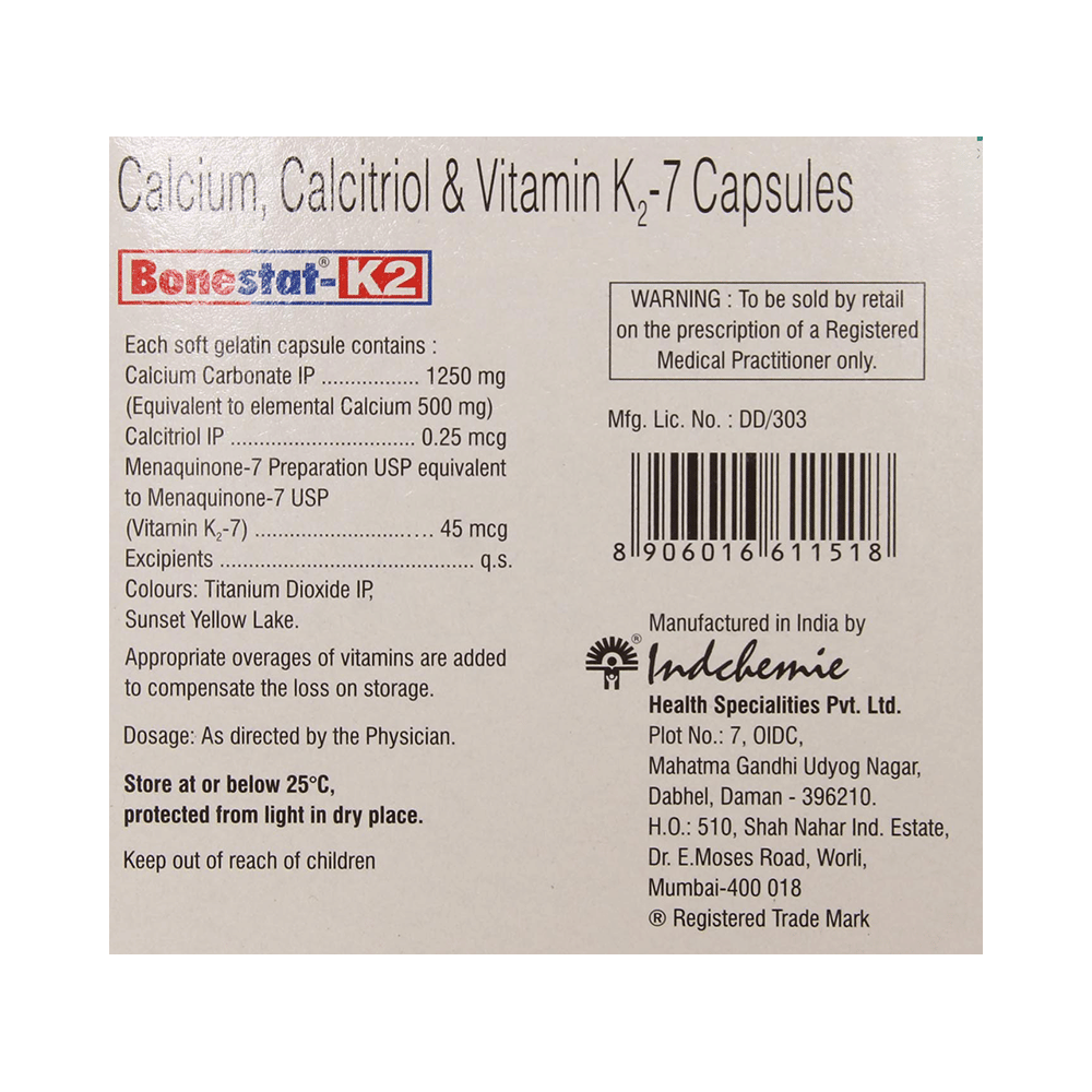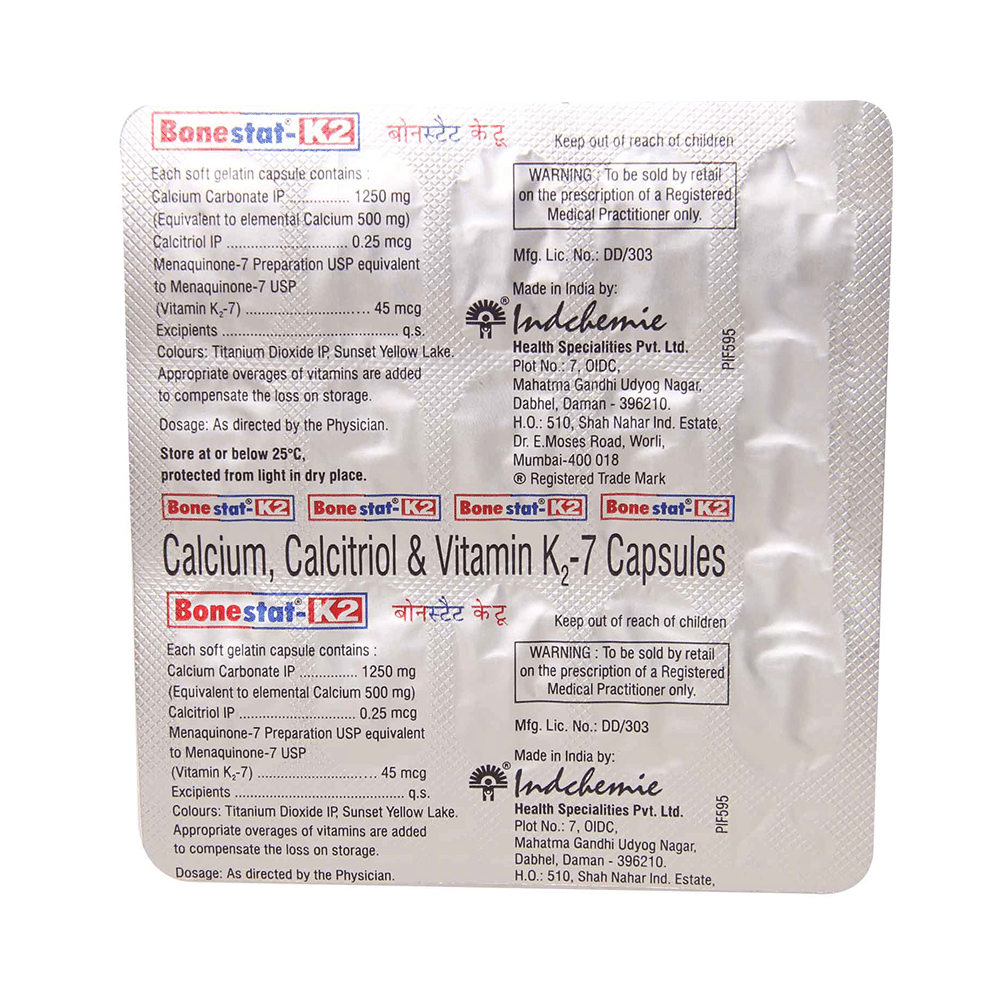 Bonestat-K2 Soft Gelatin Capsule is a medicine used in the treatment of calcium deficiency. It increases the levels of vitamin D in your blood which in turn raises calcium levels in the blood by helping in the absorption of more calcium. It also helps in the treatment and prevention of osteoporosis. Bonestat-K2 Soft Gelatin Capsule is a supplement that provides extra calcium to the body. It is beneficial in increasing muscle mass, osteoporosis and in the prevention and treatment of hypocalcemia. It also helps in reducing fatigue and muscular pains. It boosts immunity and helps you maintain healthy bones. It is generally safe with little or no side effects. However, if you experience any symptoms on taking this medicine, let your doctor know.This medicine is to be taken in the dosage as advised by the doctor. Consult your doctor if you plan to take any other form of vitamin D along with this medicine Do not take any other form of vitamin D along with this medicine without consultation with your doctor. Inform your doctor if you are pregnant or breastfeeding to make sure it is safe for you. Let your doctor also know if you have kidney disease or any other medical conditions.