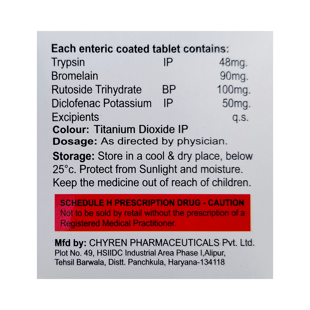 Salt Composition: Bromelain (90mg) + Diclofenac (50mg) + Rutoside (100mg) + Trypsin Chymotrypsin (48mg)