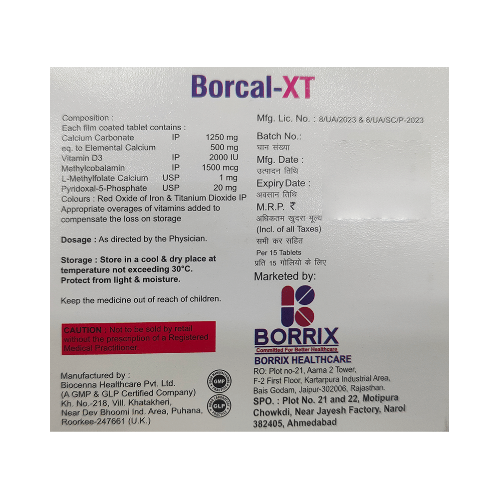Borcal-XT Tablet is a combination of five medicines : Calcium Carbonate, Vitamin D3, Methylcobalamin, L-Methyl Folate Calcium, and Pyridoxal-5-phosphate. Calcium carbonate is a dietary supplement used when the amount of calcium taken in the diet is not enough. Vitamin D3 is a form of vitamin D. It raises vitamin D levels in your blood. This in turn raises calcium levels in your blood by helping you absorb more calcium from food. Methylcobalamin is a form of vitamin B12 that restores its level in the body thereby helping in treating certain anemias and nerve problems. L-Methyl Folate Calcium and Pyridoxal-5-phosphate are nutritional supplements that provide essential nutrients to our body and improve overall health.